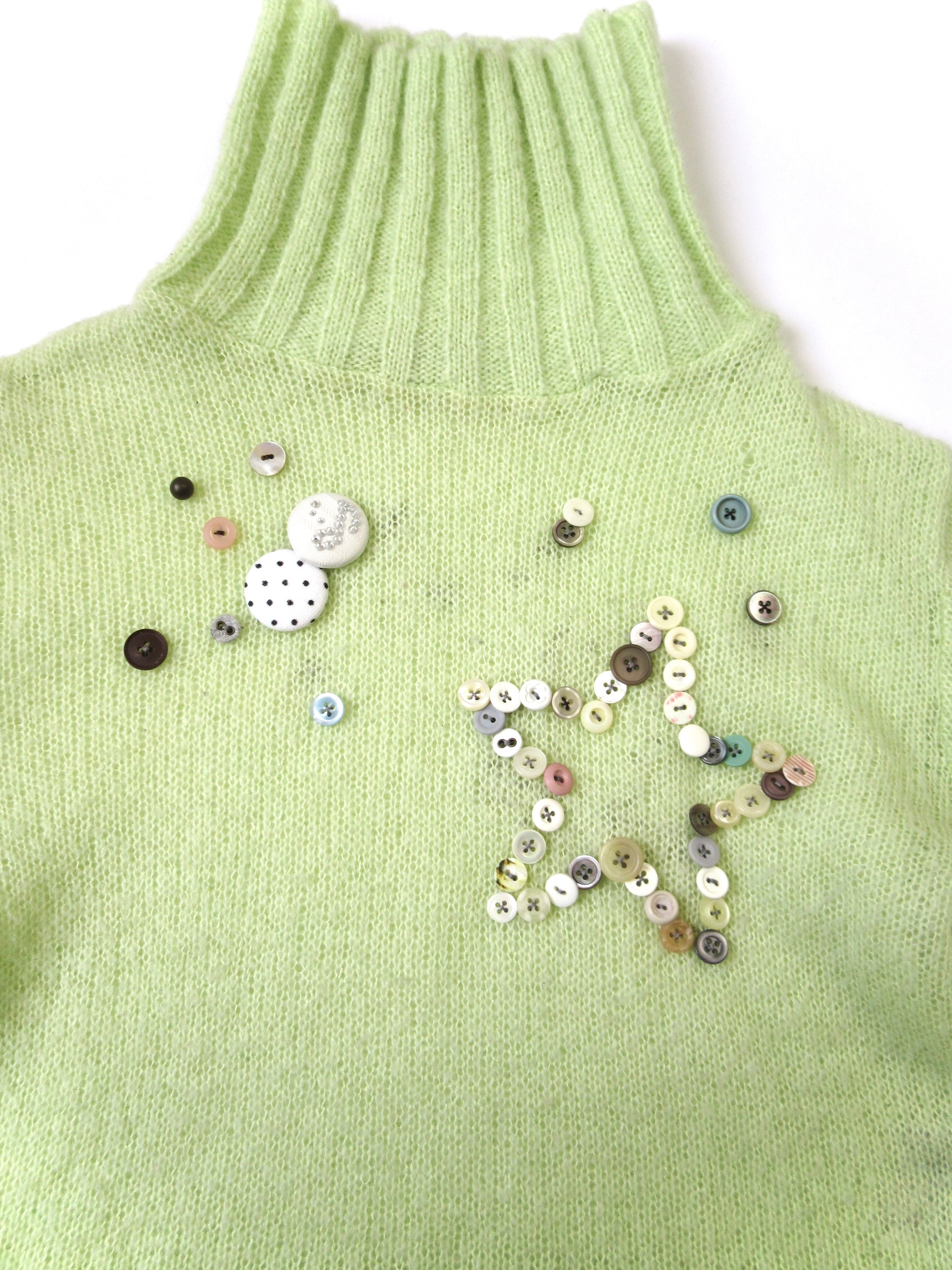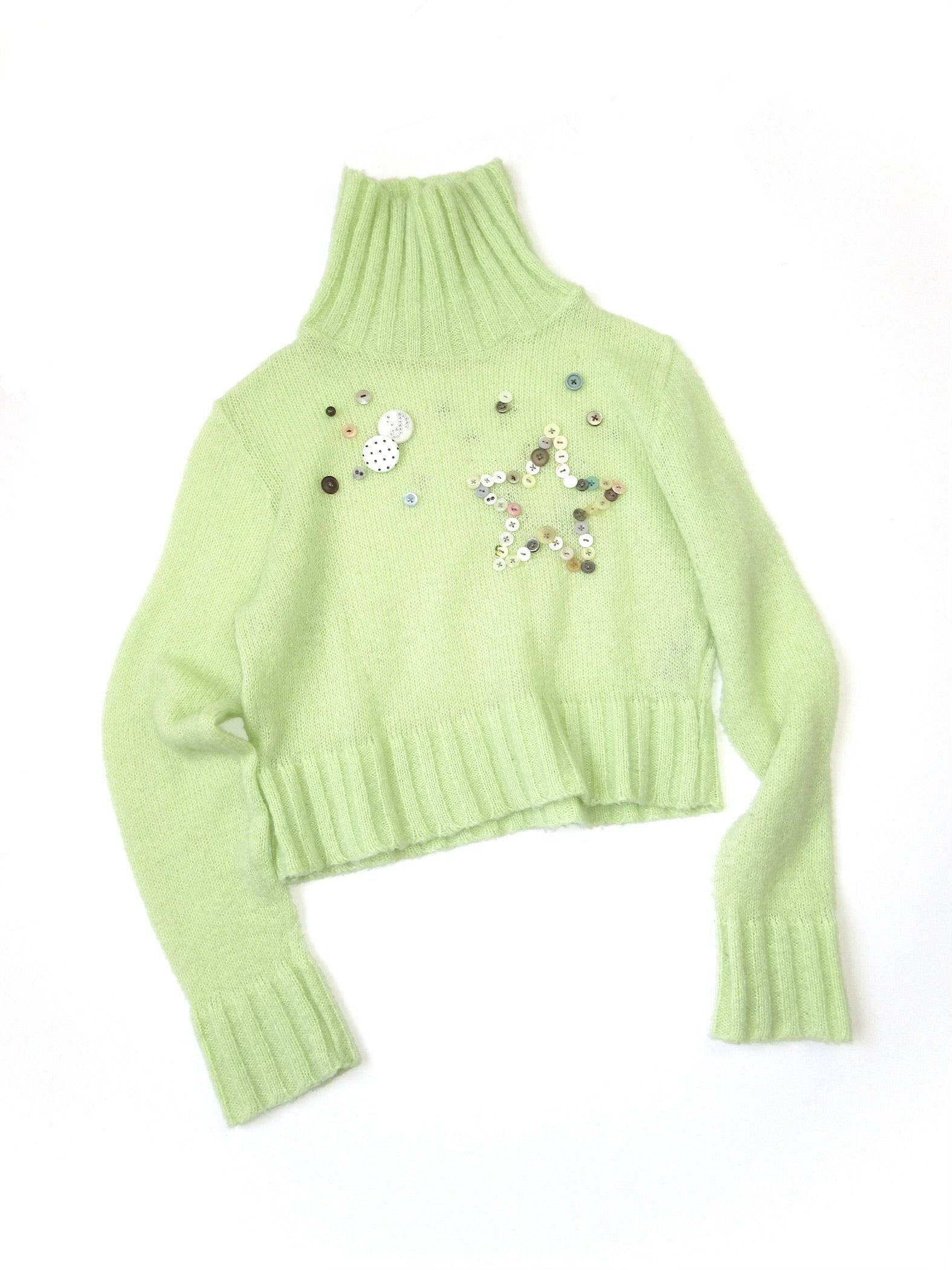 ♫や★をボタンであしらいました。ニットの色に合わせたパステル調に仕上げ、春先取り気分にぴったり☑︎ニットに透け感があるので、レイヤリングで雰囲気を変えて楽しむのも◎