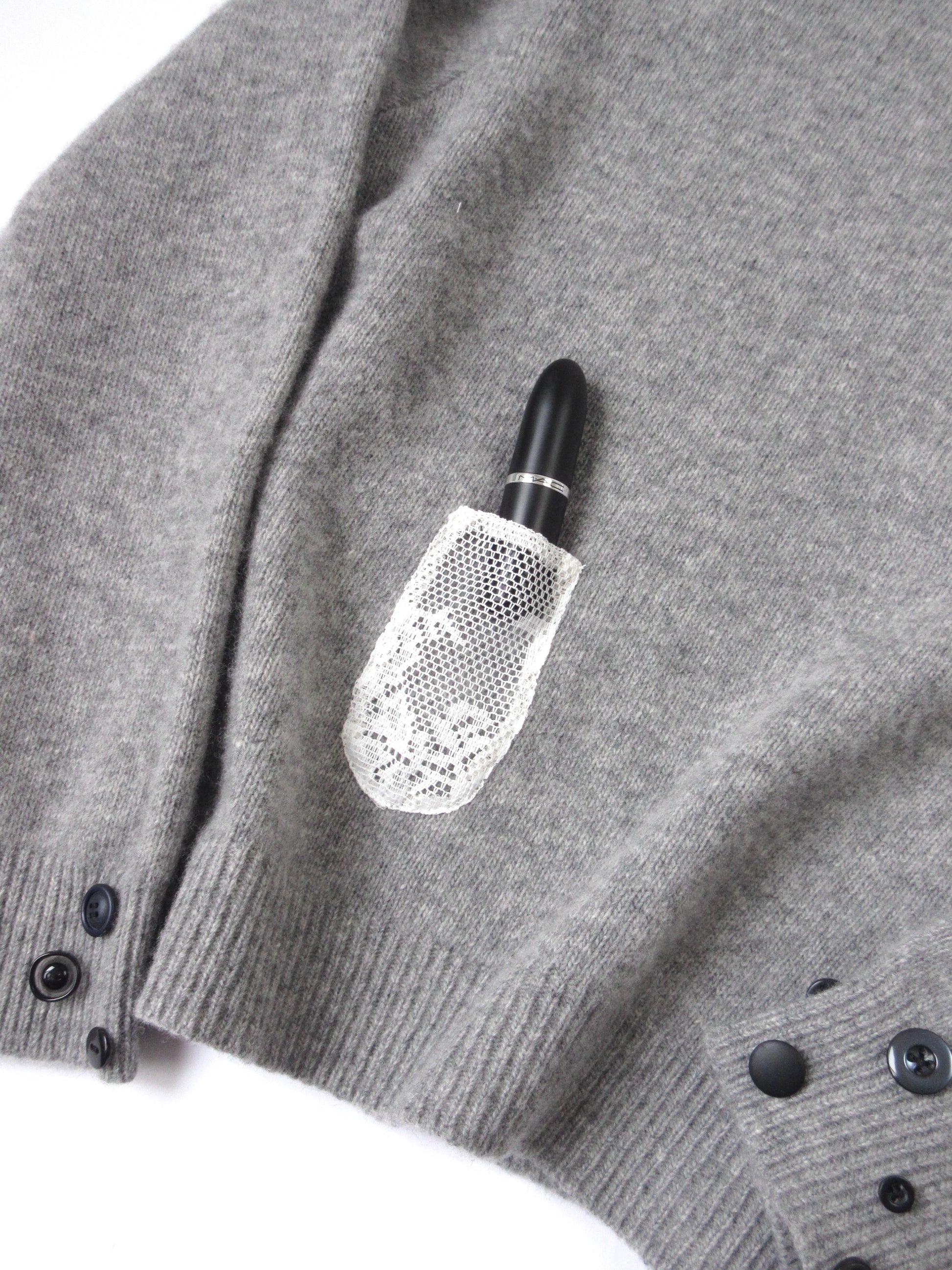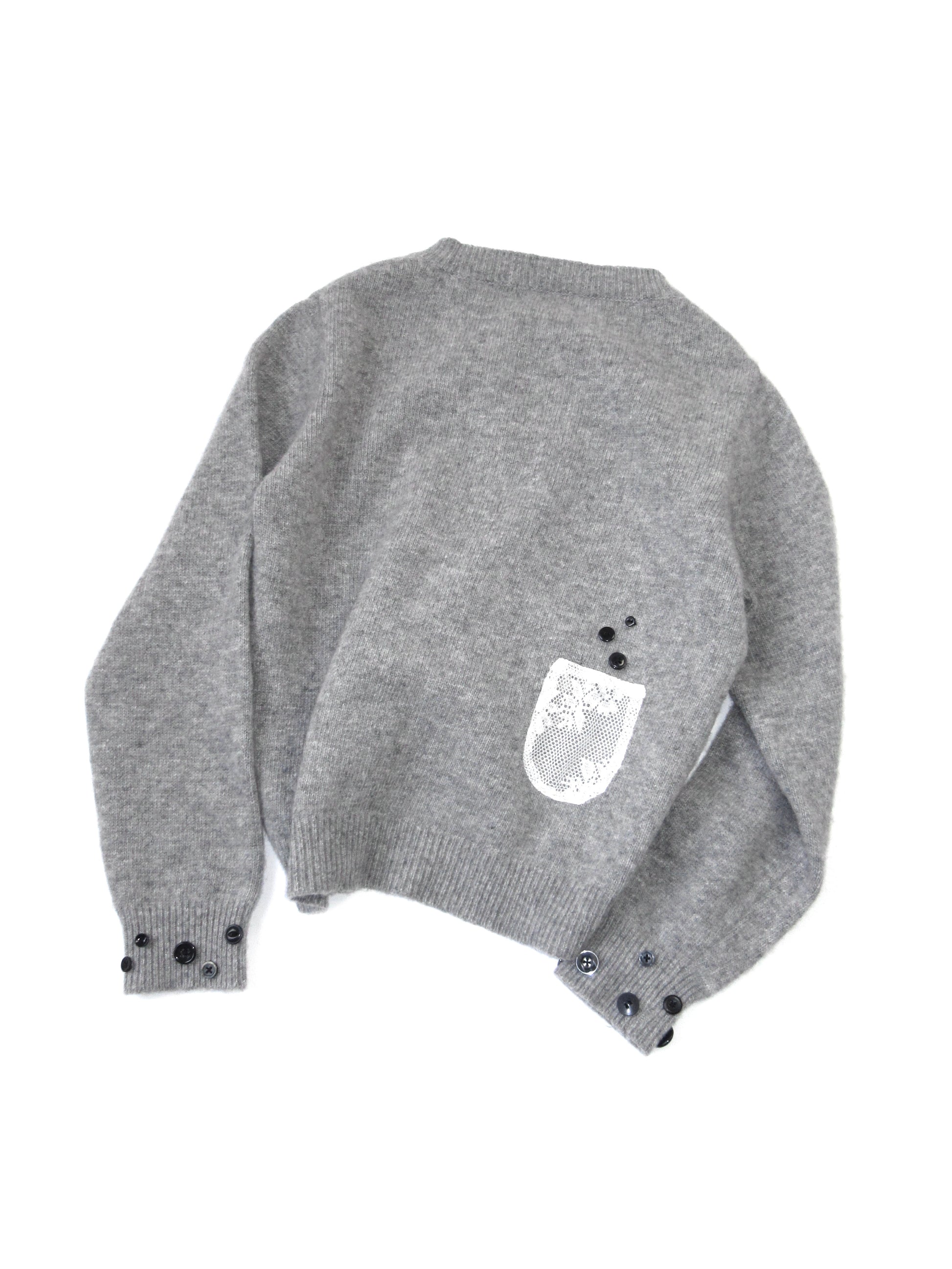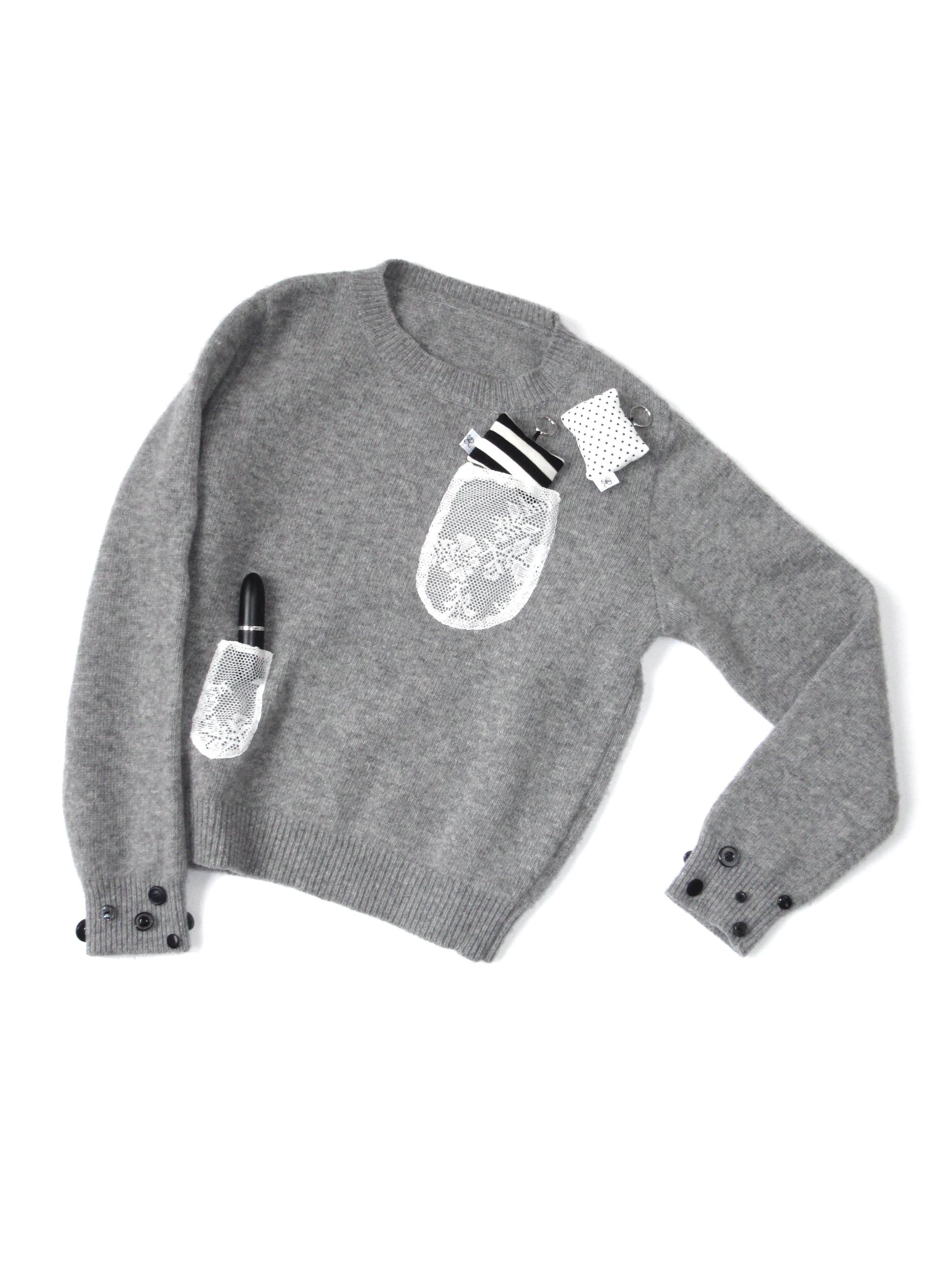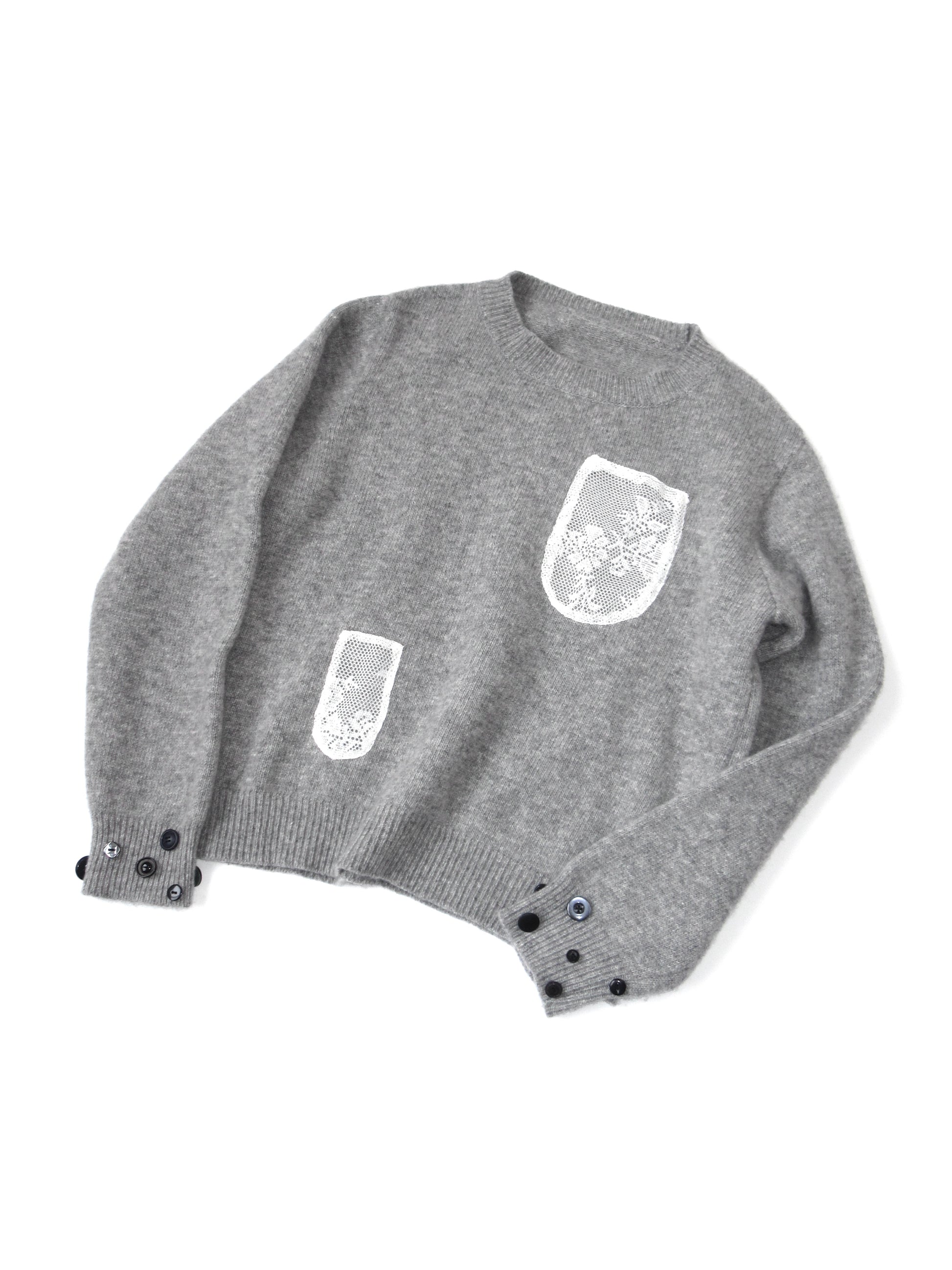 レース生地で製作したサイズ違いの3つのポケットがポイントのニットトップス。1番小さなポケットはペンやリップがぴったり入るサイズ◎身幅はゆとりがありつつ、短めの着丈でシルエットも可愛いです。若干の毛羽立ちがありますが、その他汚れやダメージのない比較的良好なコンディションです。