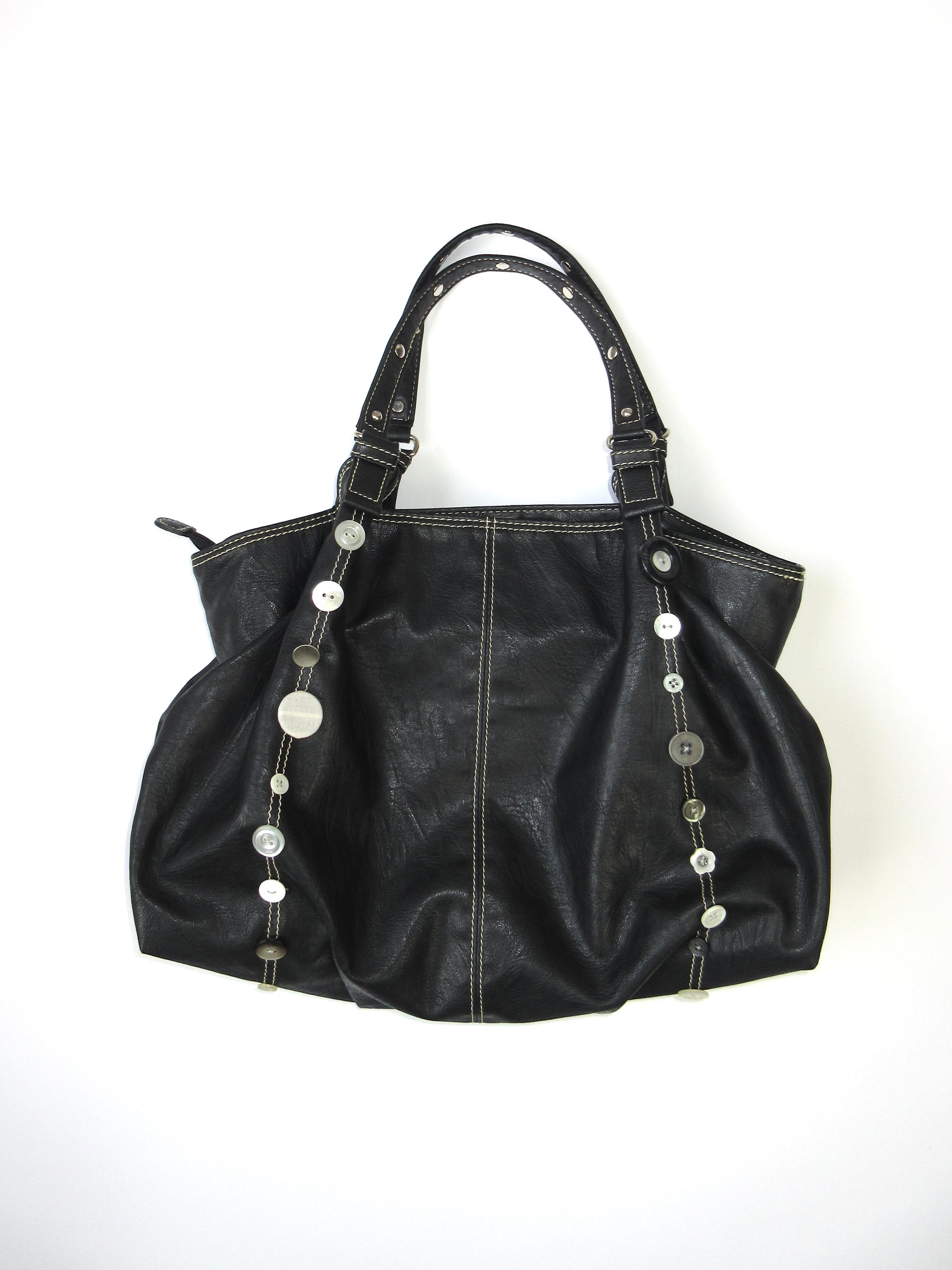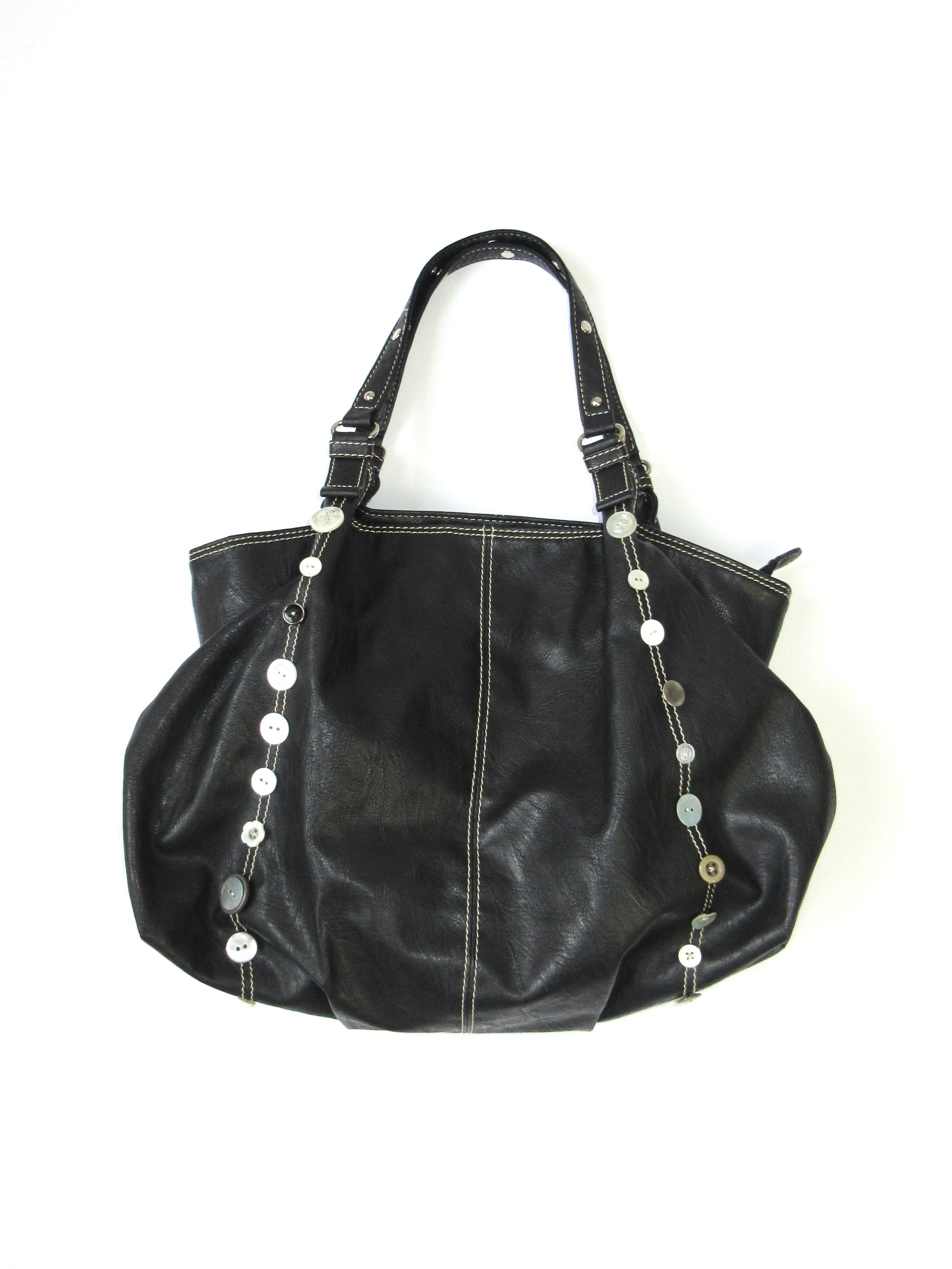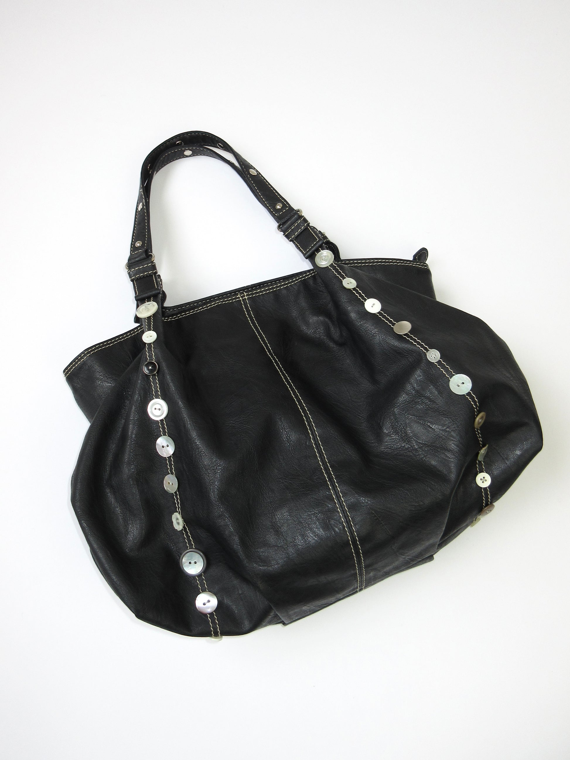 様々なボタンをつけましたが、グレーやホワイトカラーで統一感を持たせました。ストラップ部分につけたカシメもポイント⋆✦ 落ち着いた雰囲気のコーデにも可愛らしいポップな雰囲気にもマッチするアイテムかと思います! やや使用感があり、レザー特有のにおいがあるコンディションです。