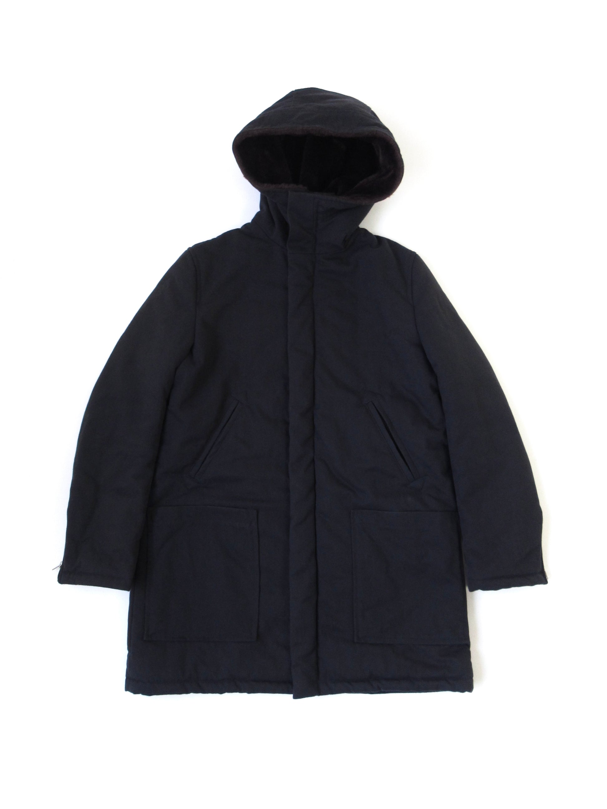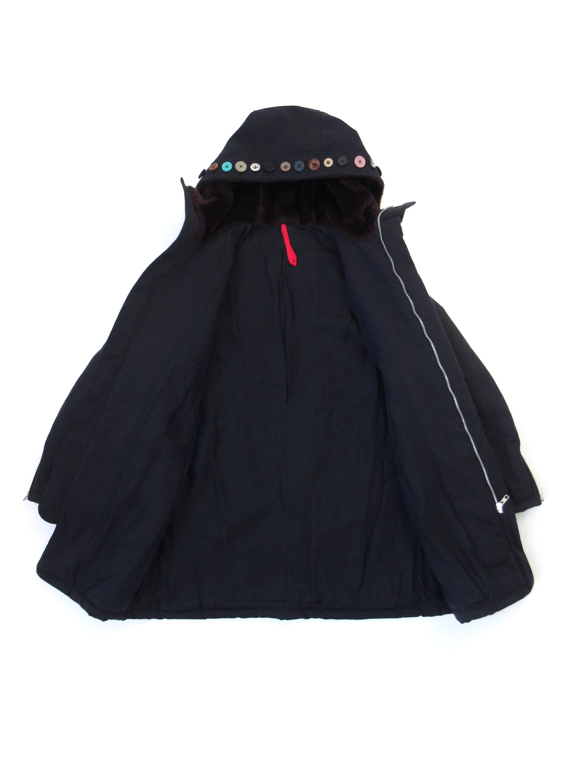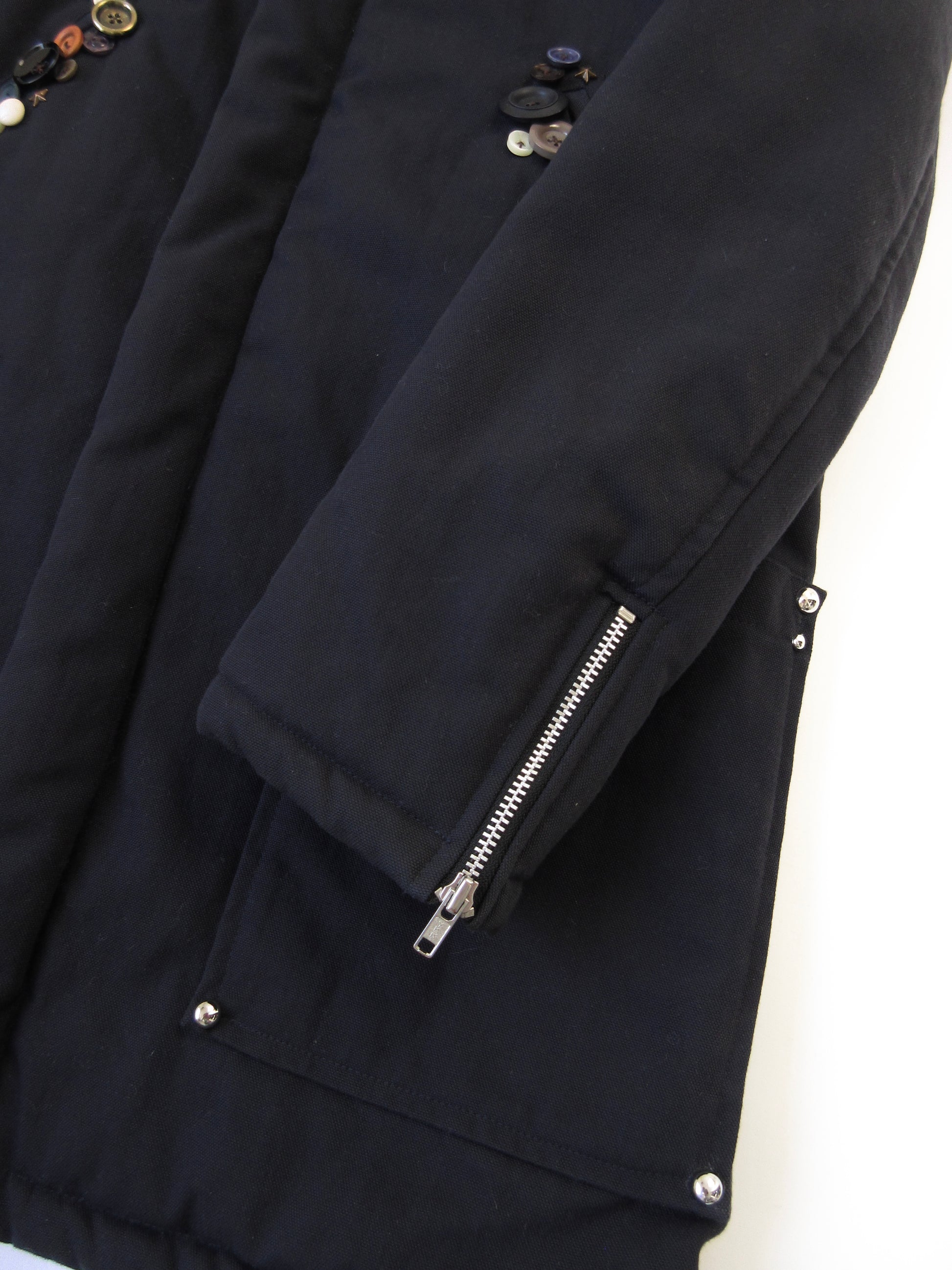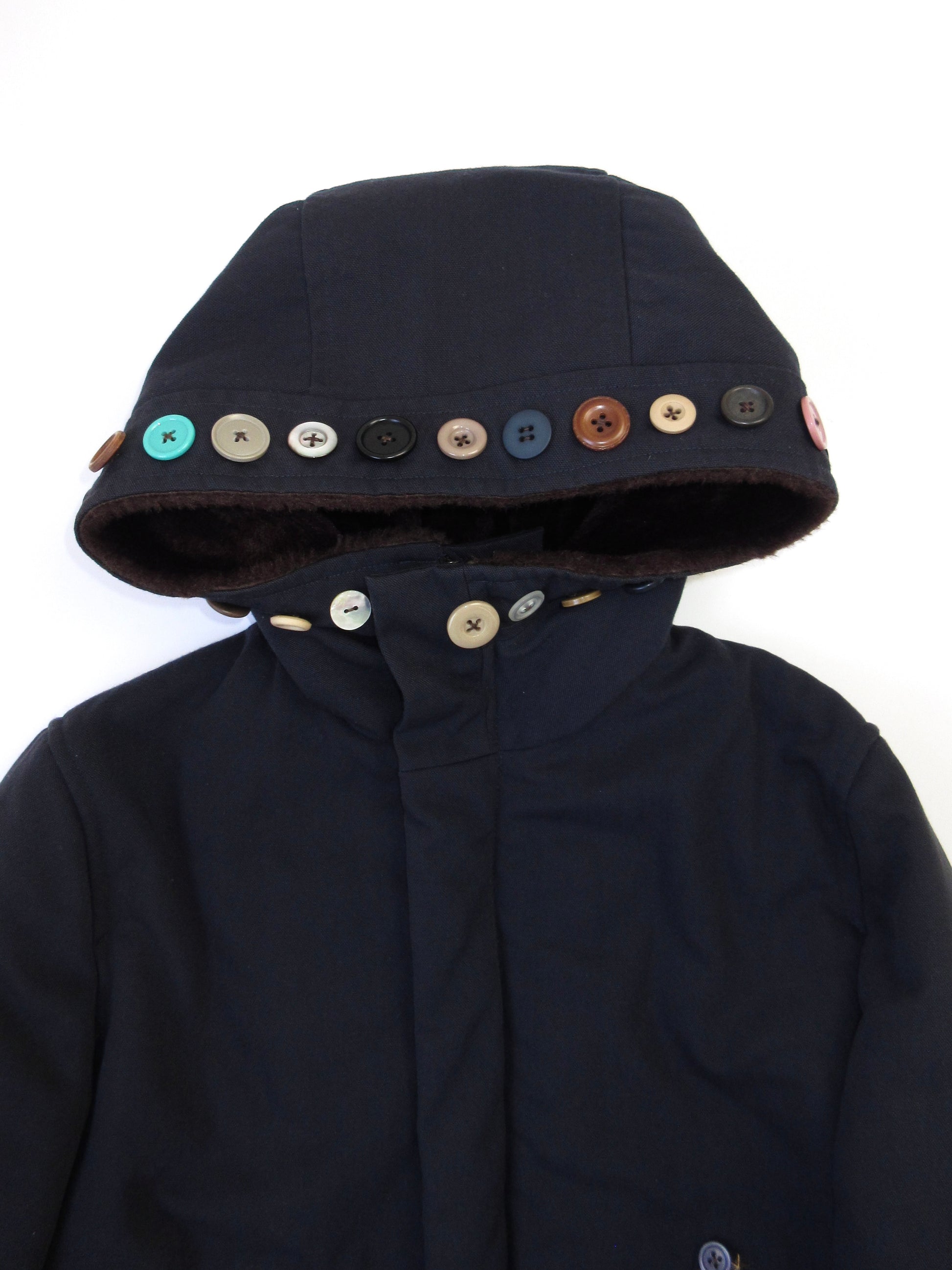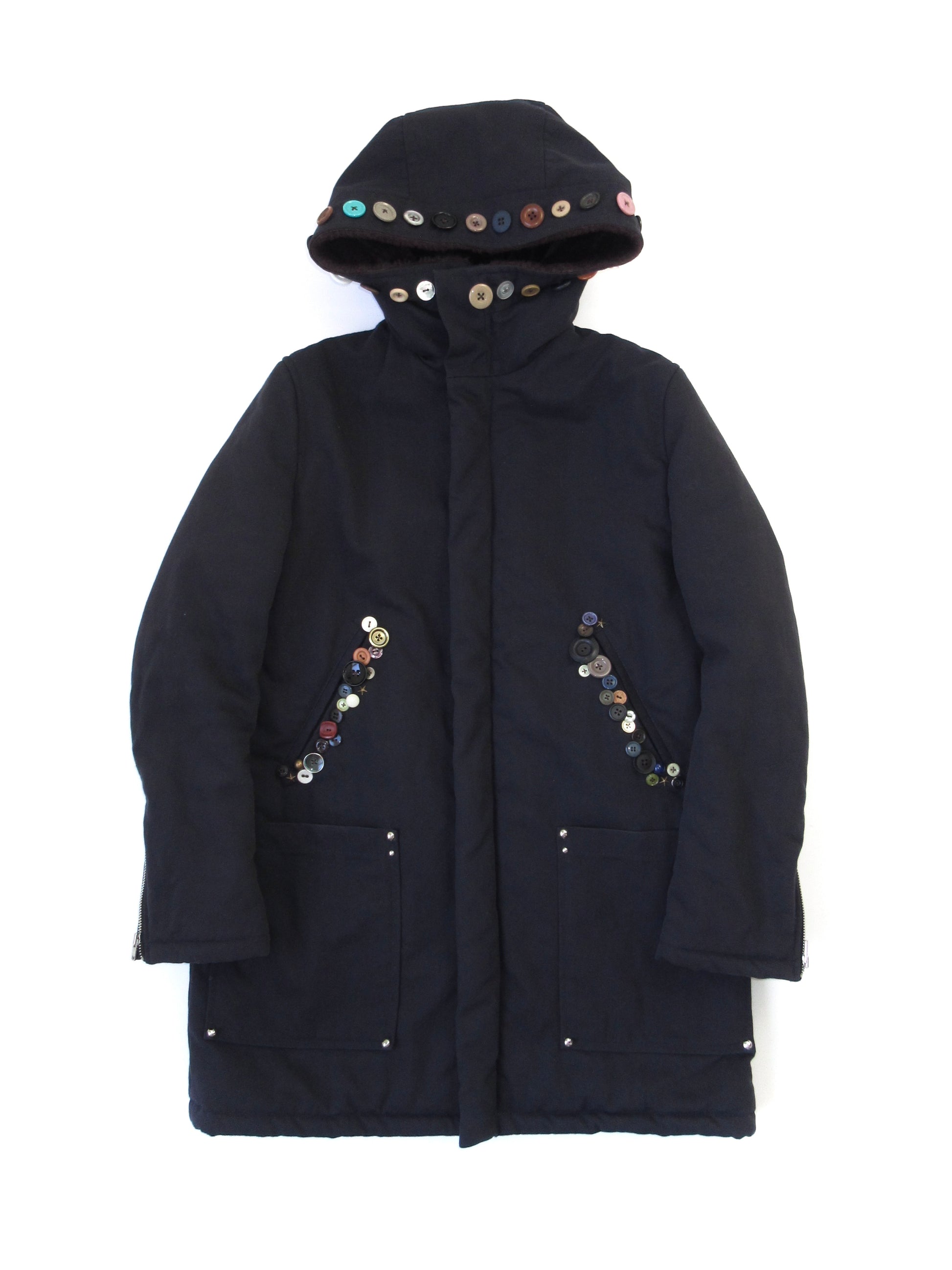 フードやポケットにふんだんにボタンを取り付けたパディングコート。様々なスタイルに合わせて着用して欲しくて、派手になりすぎないよう意識しました。着用の際には目立ちにくいですが全体にやや毛羽立ちがあります。