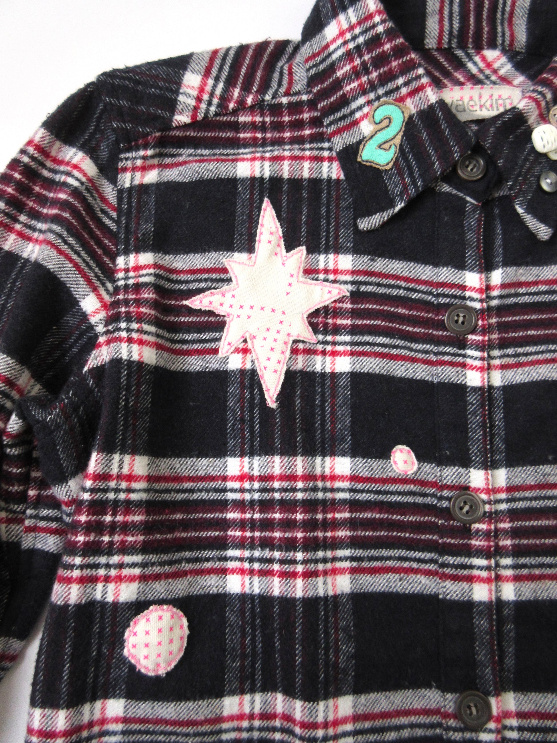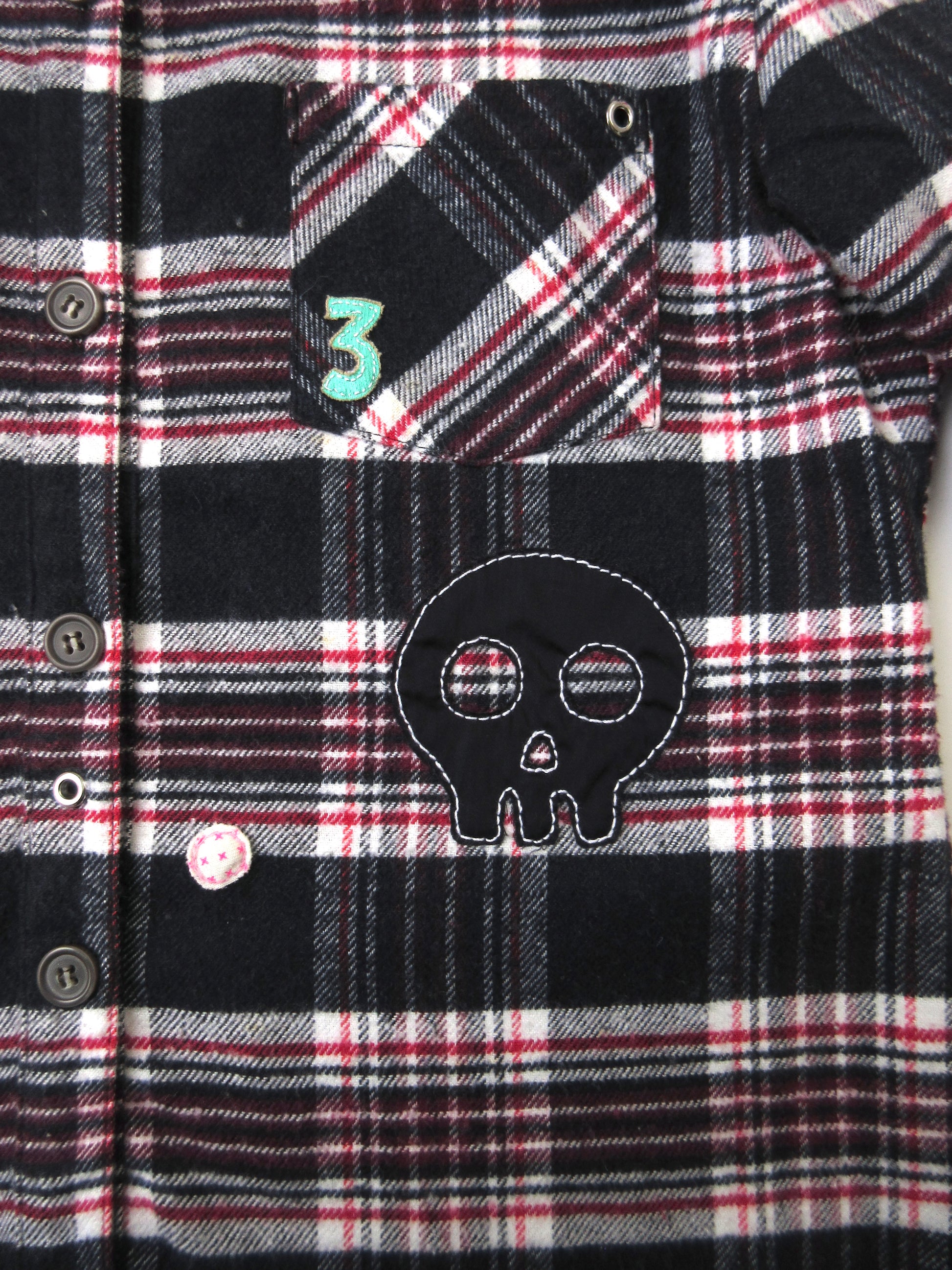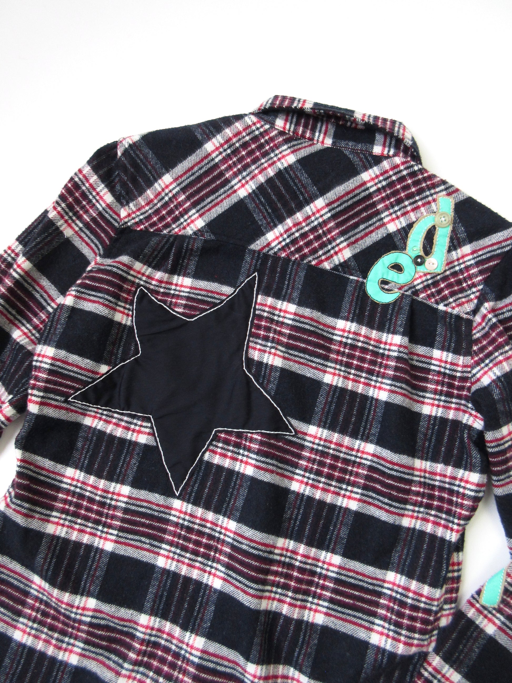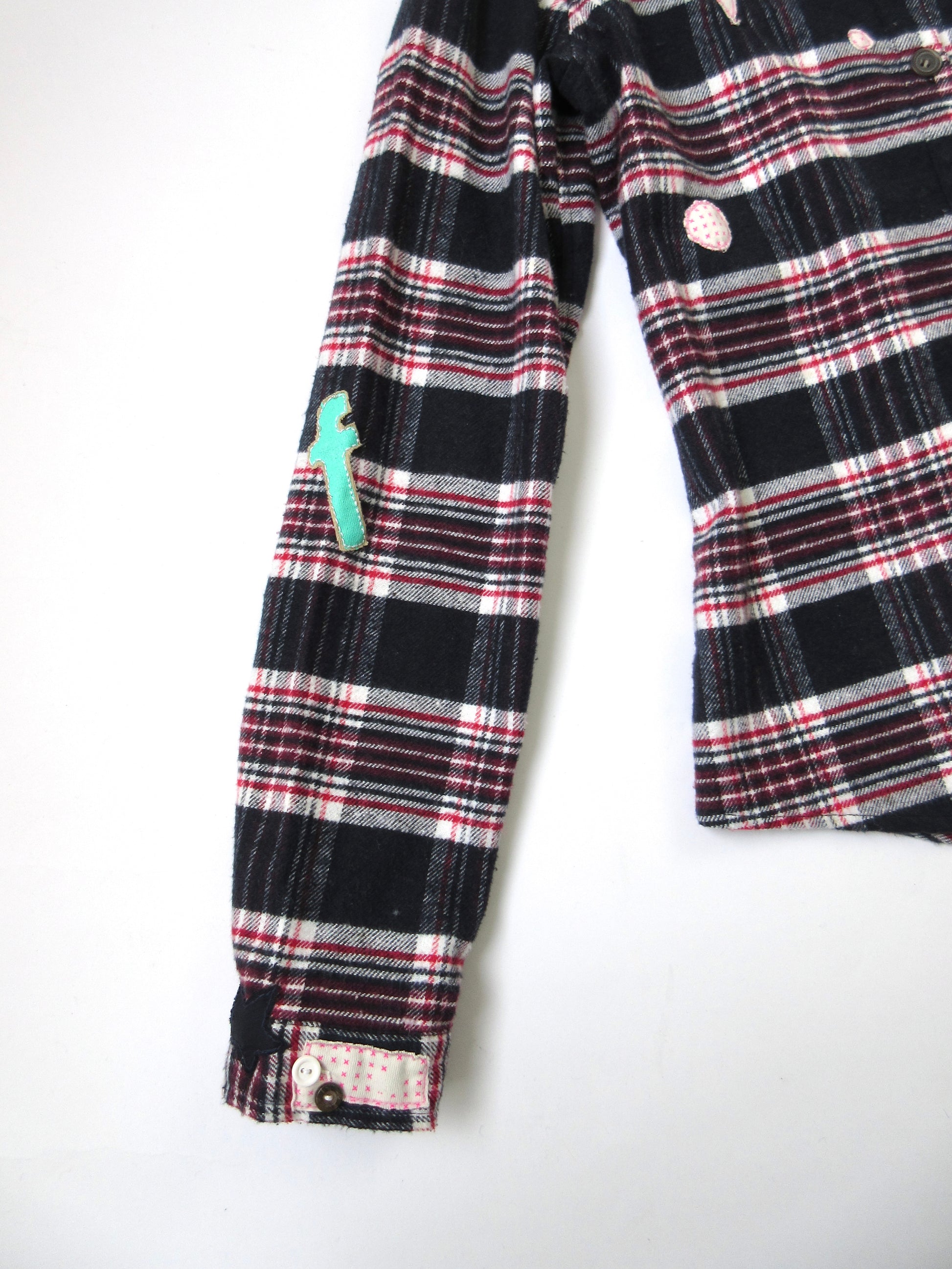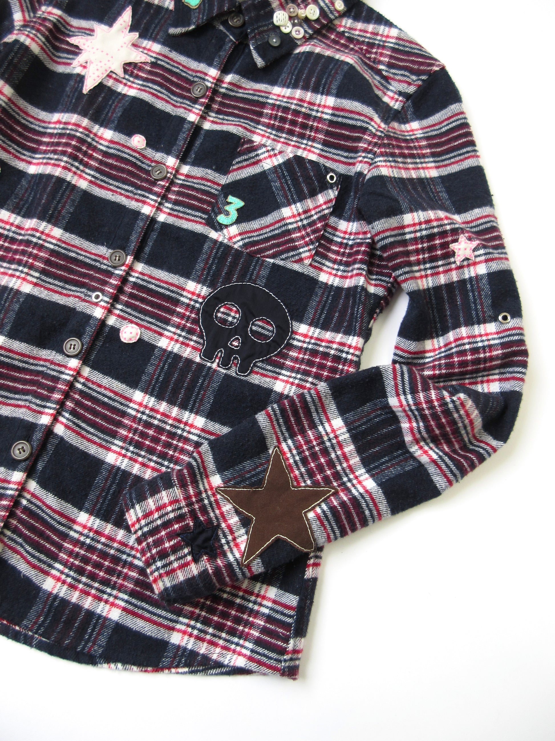 ワッペンのようにカットワークした様々な素材を手縫いでトッピングし、ポップ×キュートな雰囲気に仕上げました✰︎☠︎