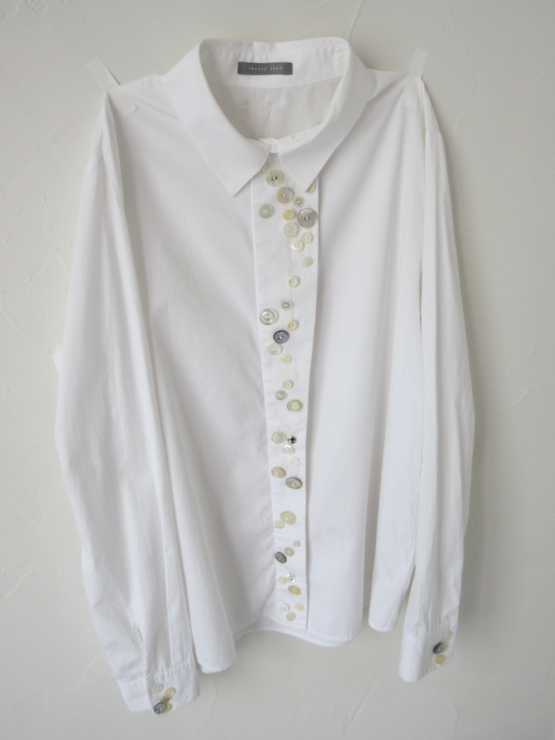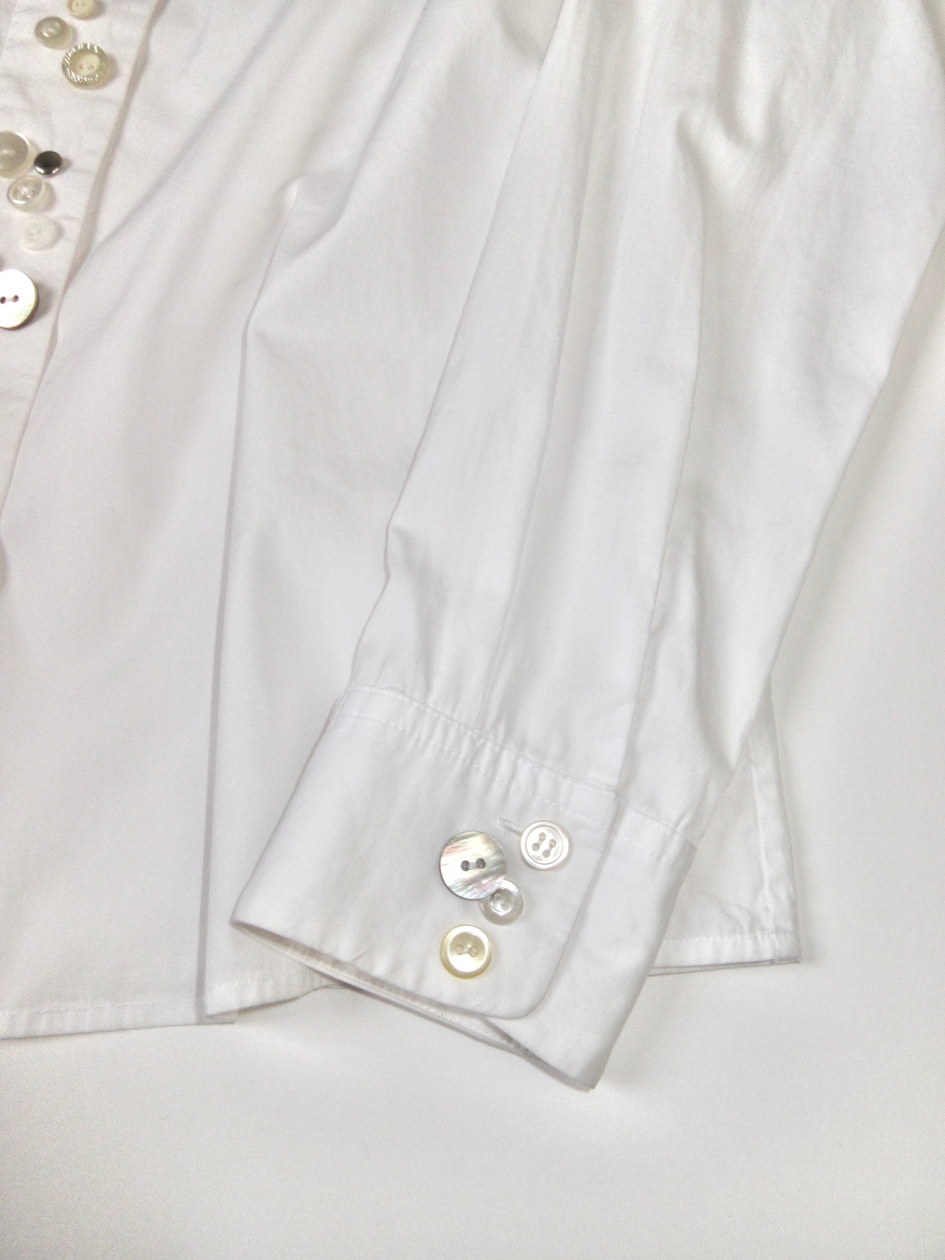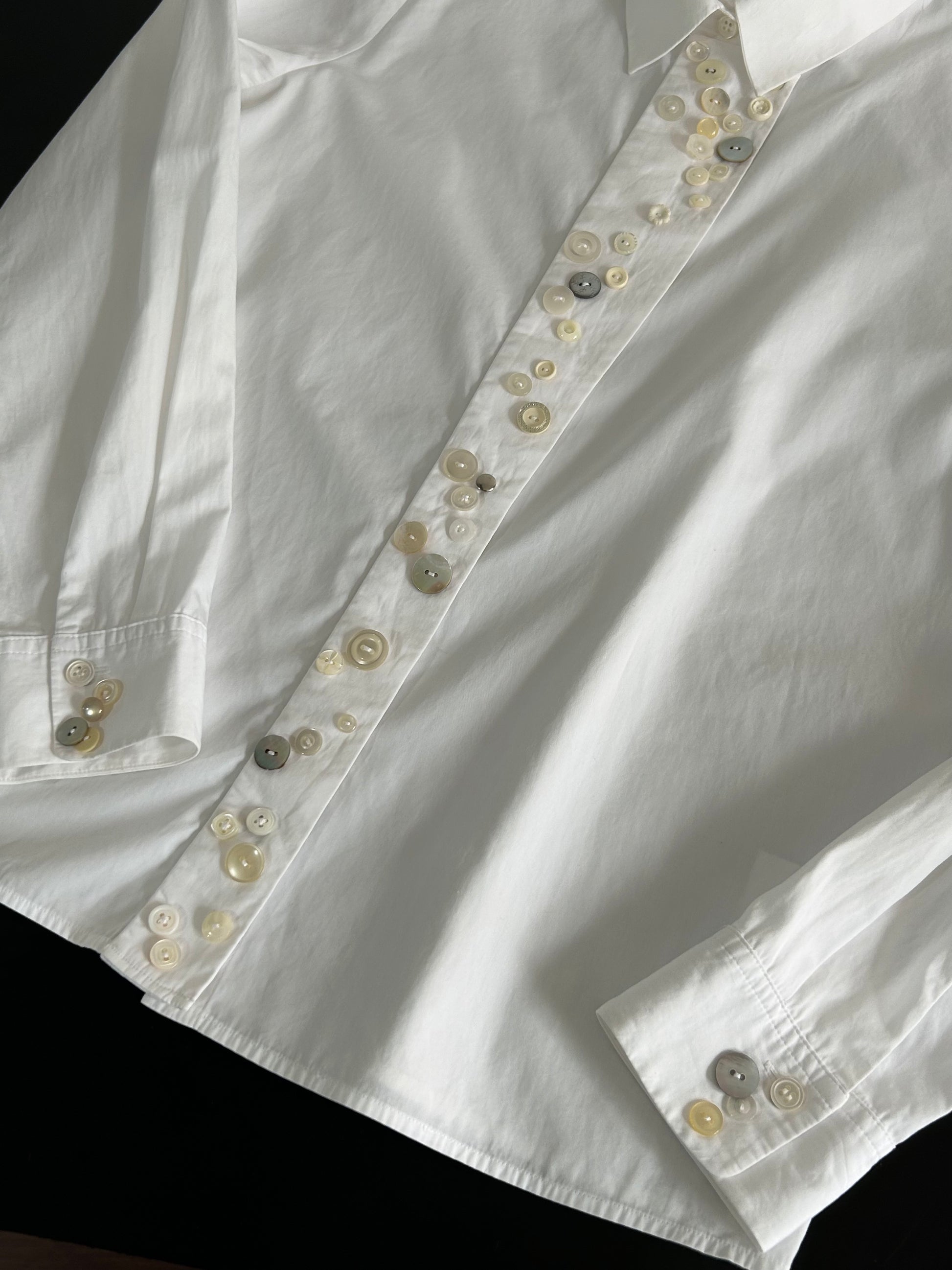 幅の広いフライフロントデザインのシャツにボタンを散りばめました。ピシッと一枚でボタンを際立たせても素敵ですし、羽織としても使え万能です◎ボタンを同系色でまとめることによって華美にならず、様々なアイテムとのコーディネートで活躍しそうな1着に仕上がりました。