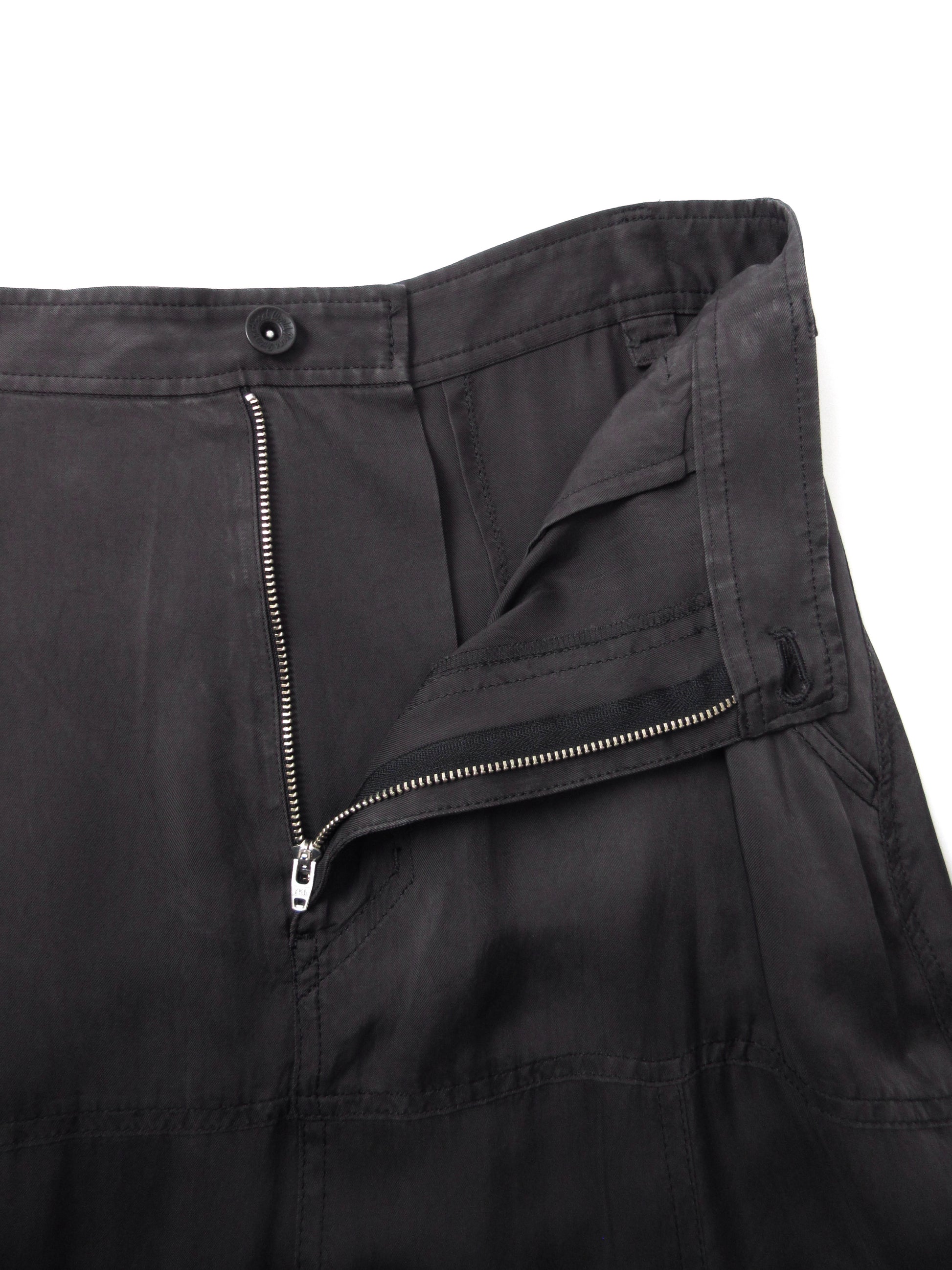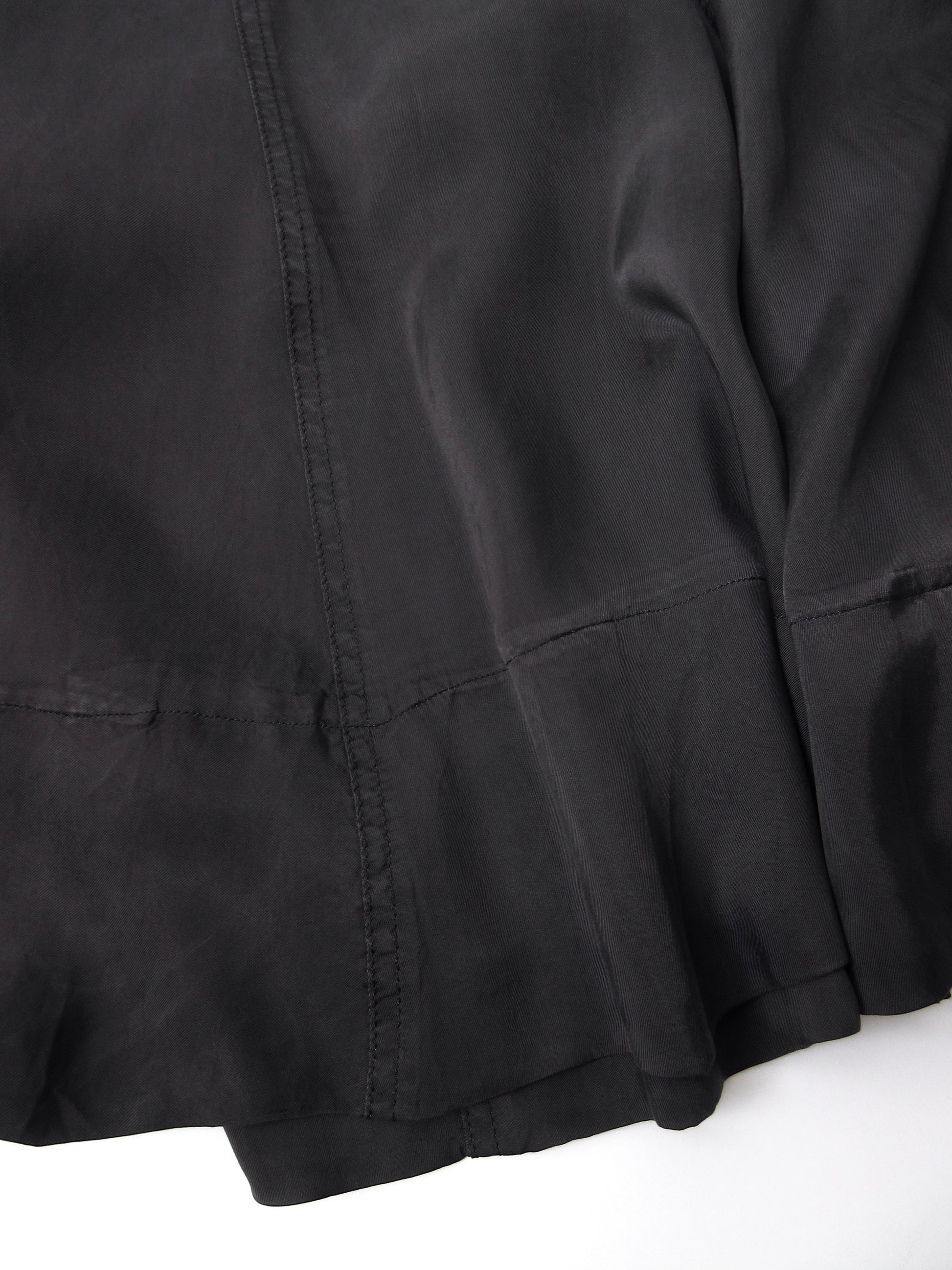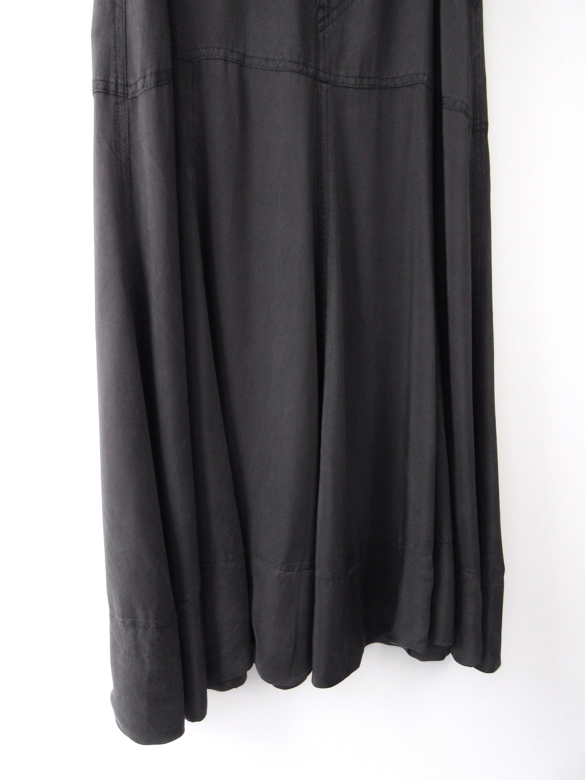 複数箇所色褪せ、水シミがございます。詳細写真をご確認くださいませ。光沢のある素材の為着用時にはあまり気にならないかと思います。絶妙なチャコールグレーカラーと歩くたびに揺れるて生じるドレープが美しい1着。