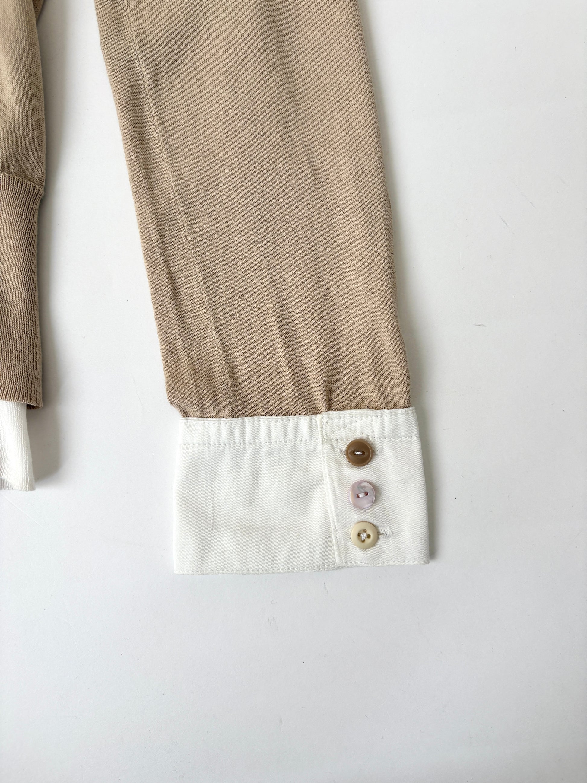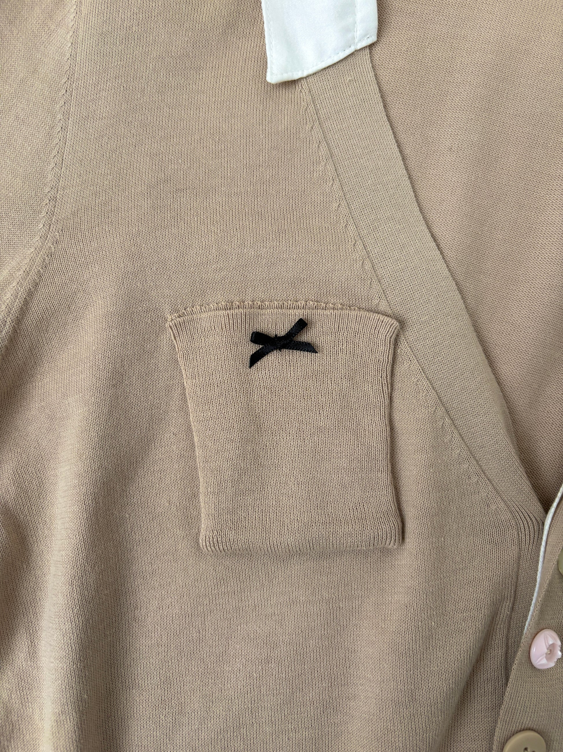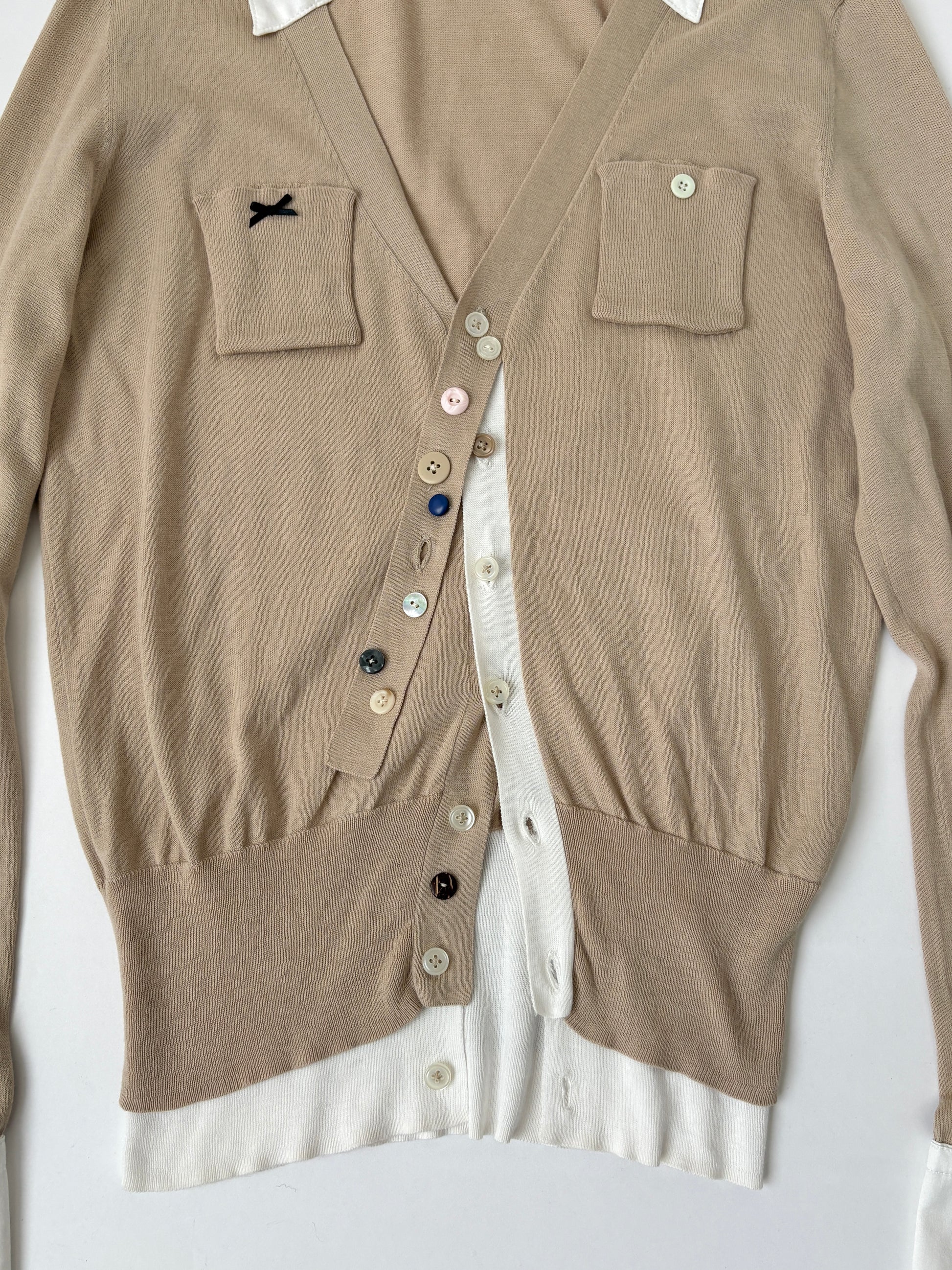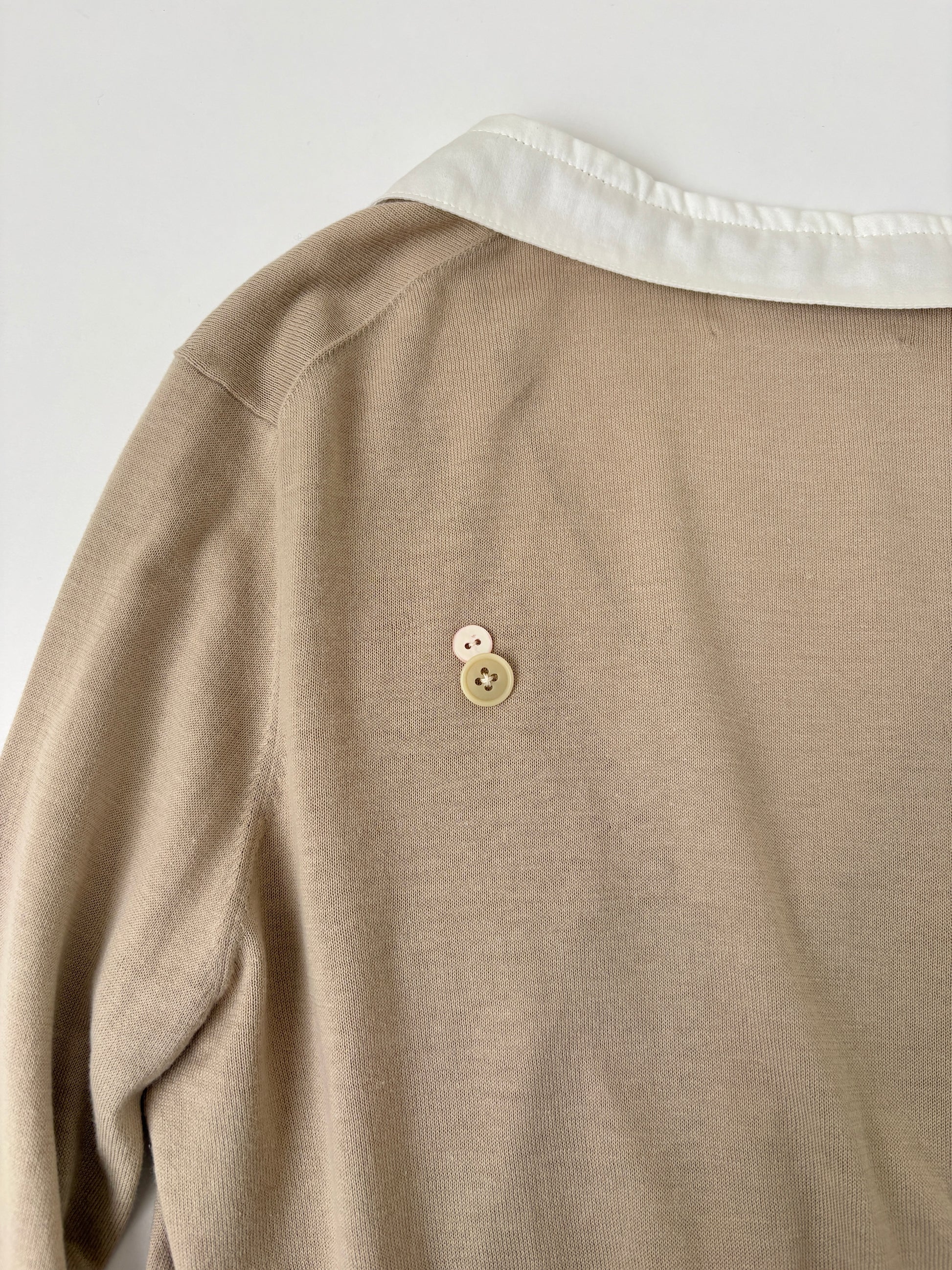 元々のレイヤード風デザインを活かしつつ、カーディガンにシャツをドッキングした一着です。胸元のポケットもポイント✓ ガーリーな雰囲気ですが、落ち着いたカラーなので合わせるアイテムを選ばずコーデを楽しめます𓈒◌