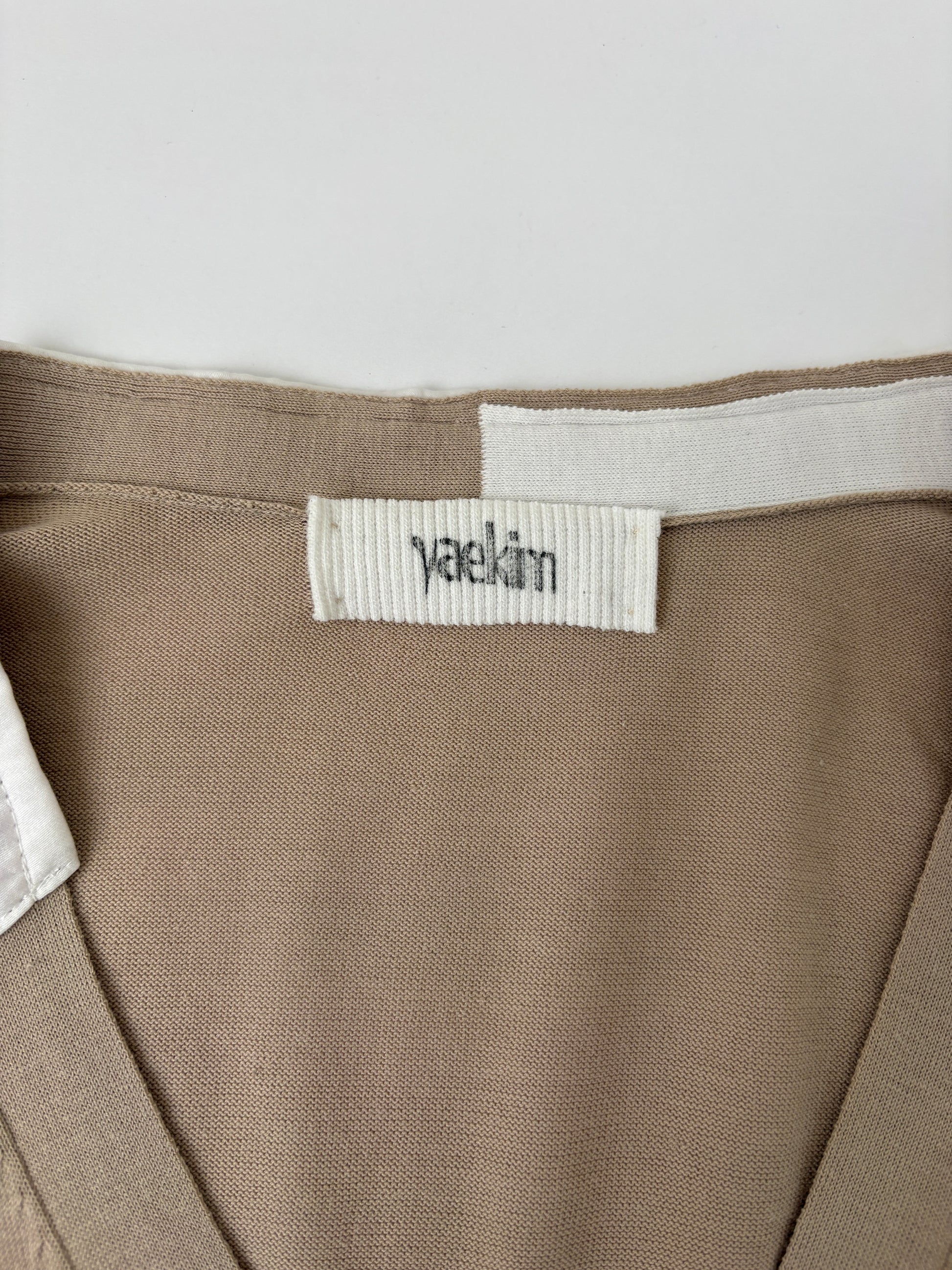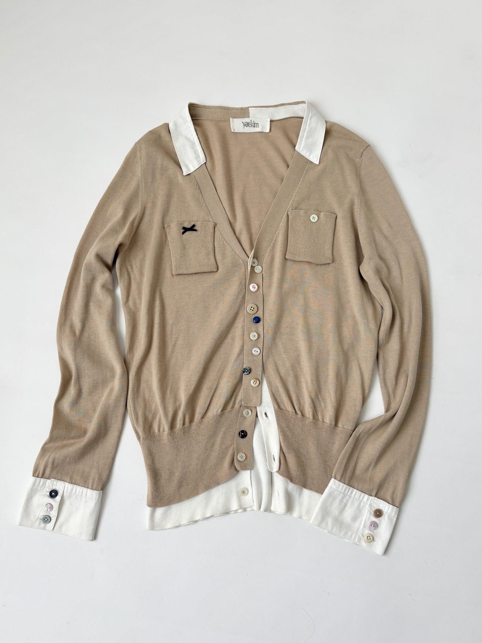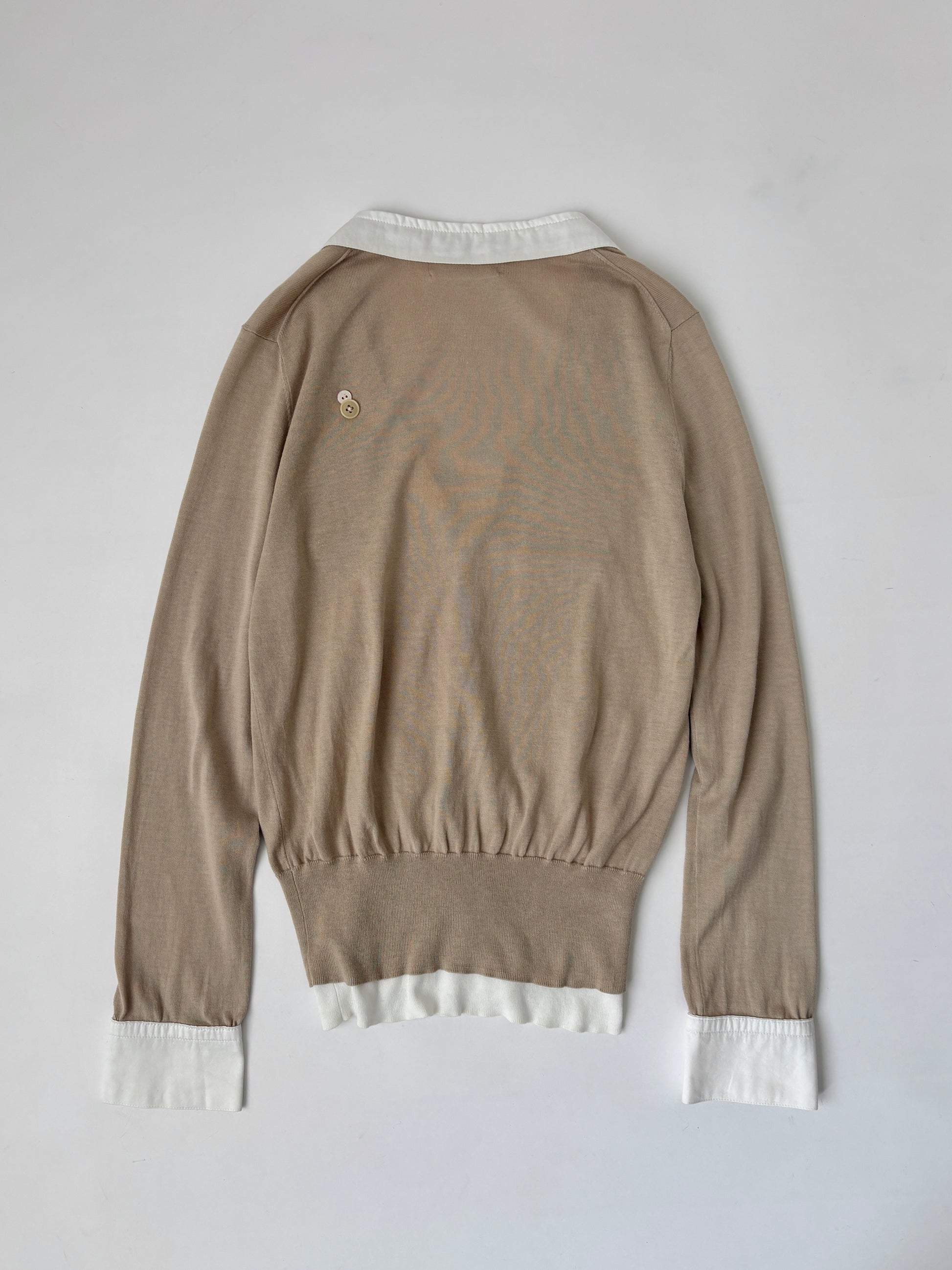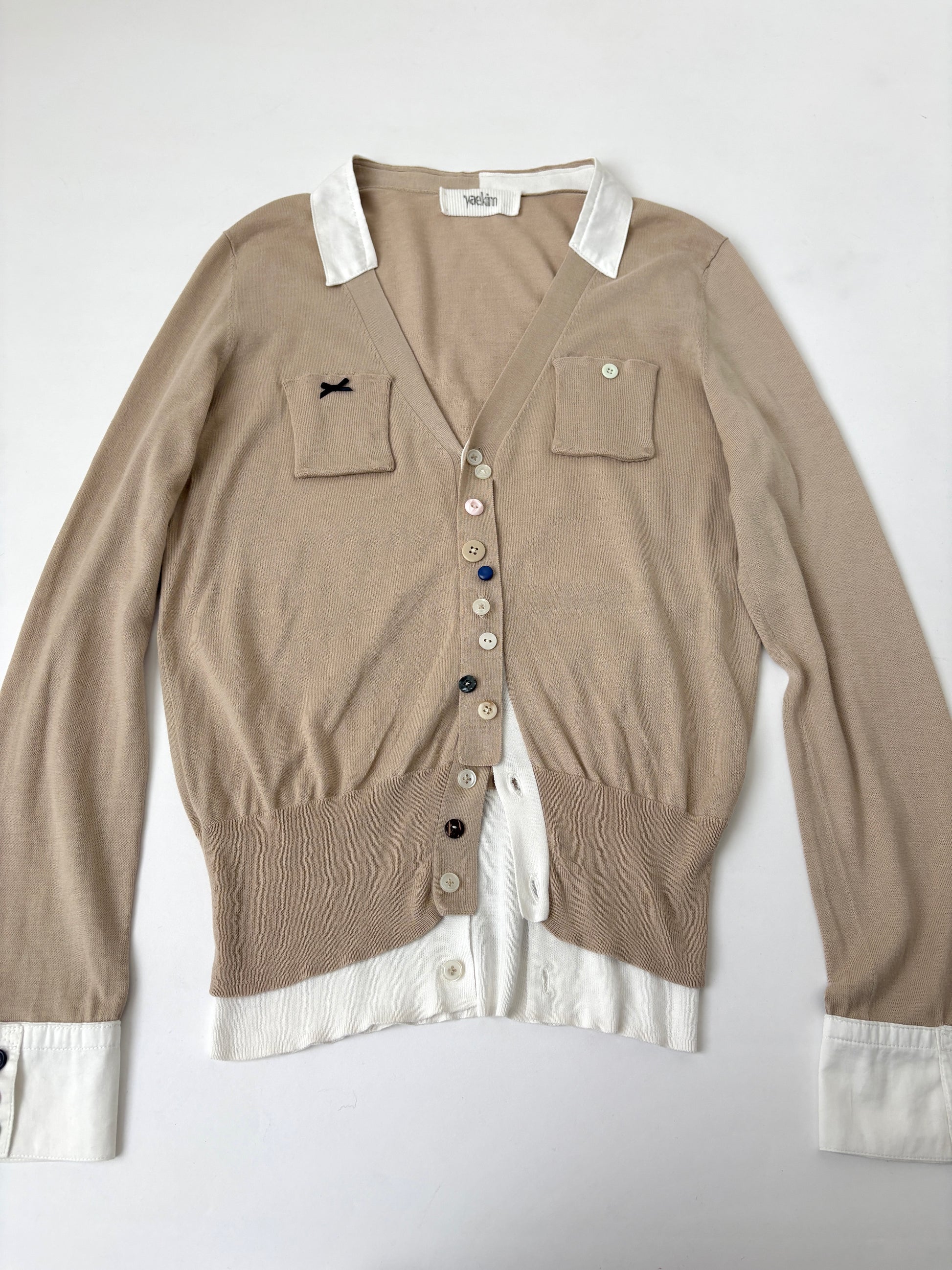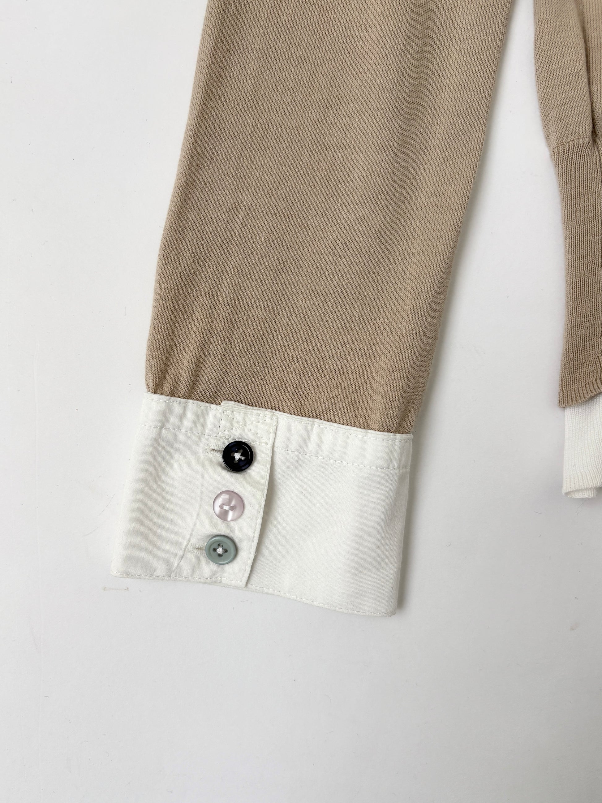 元々のレイヤード風デザインを活かしつつ、カーディガンにシャツをドッキングした一着です。胸元のポケットもポイント✓ ガーリーな雰囲気ですが、落ち着いたカラーなので合わせるアイテムを選ばずコーデを楽しめます𓈒◌