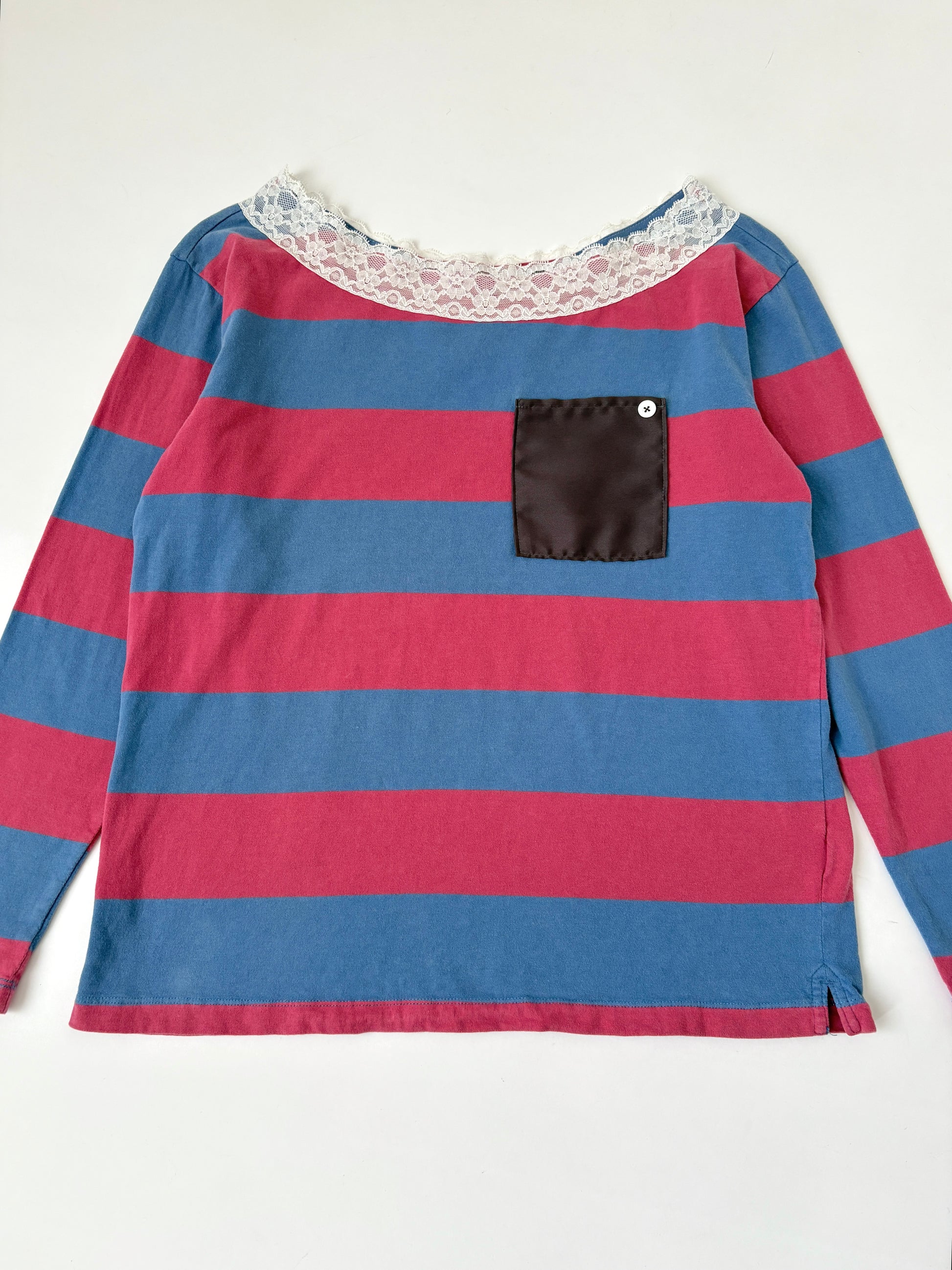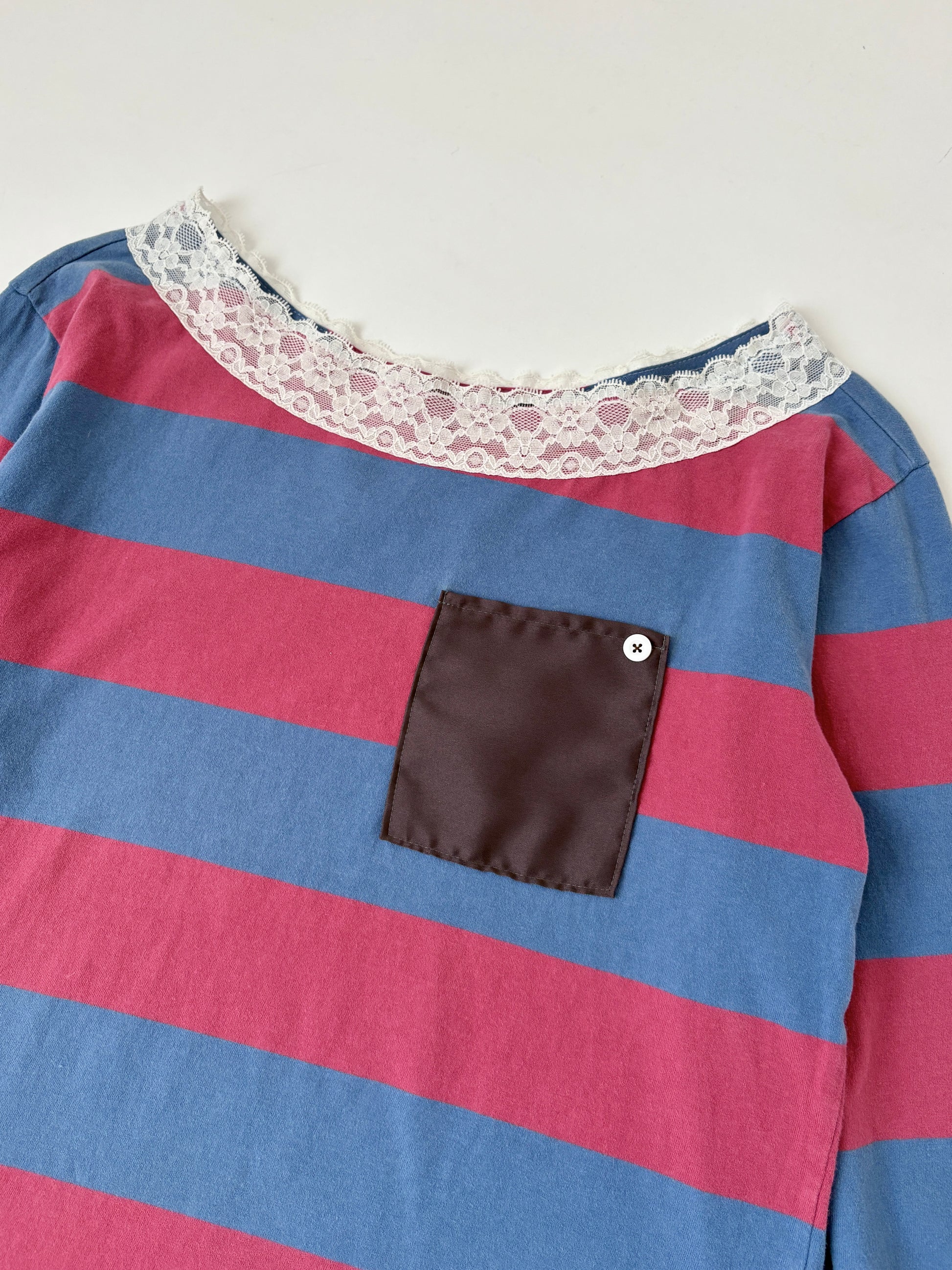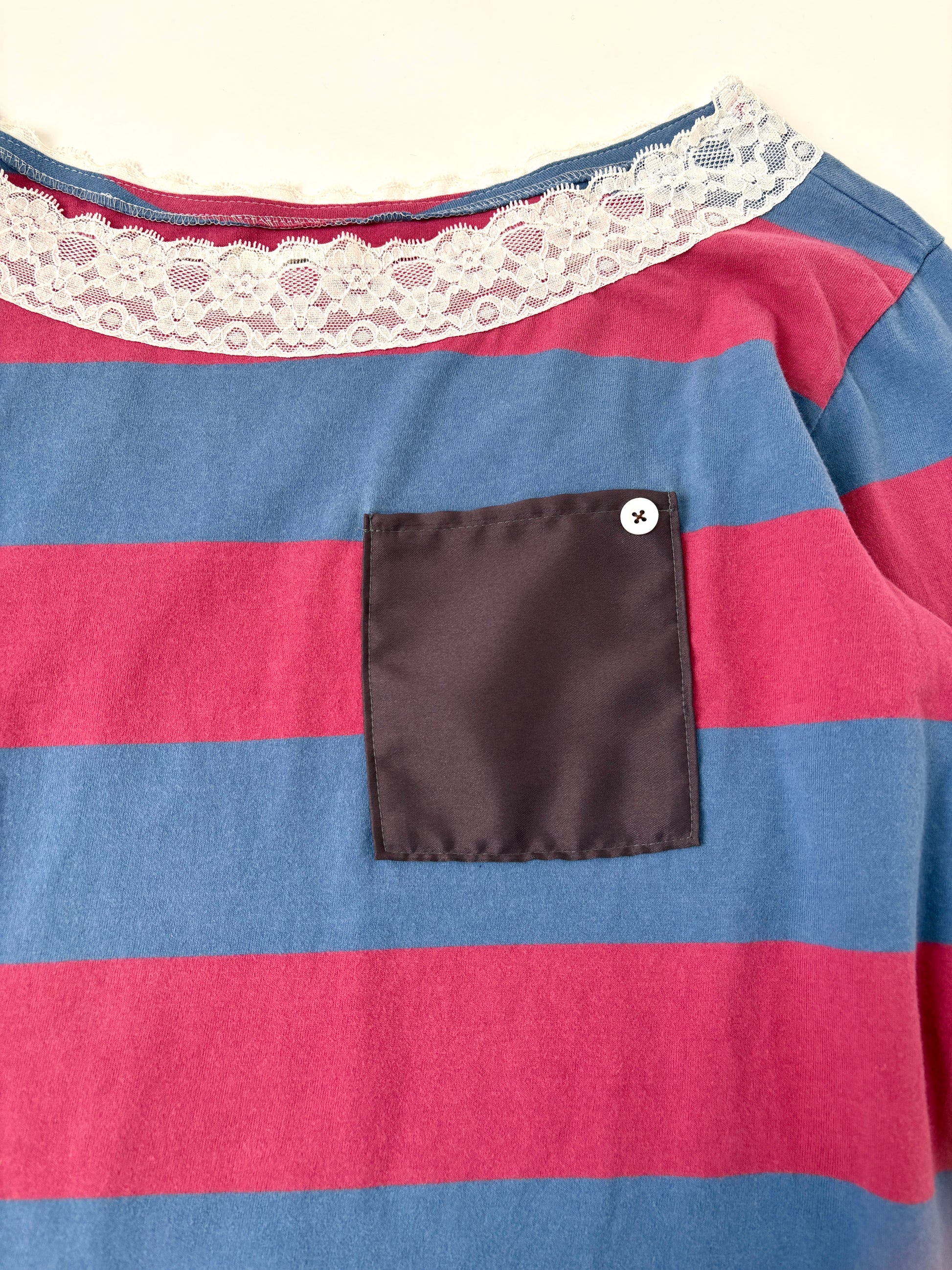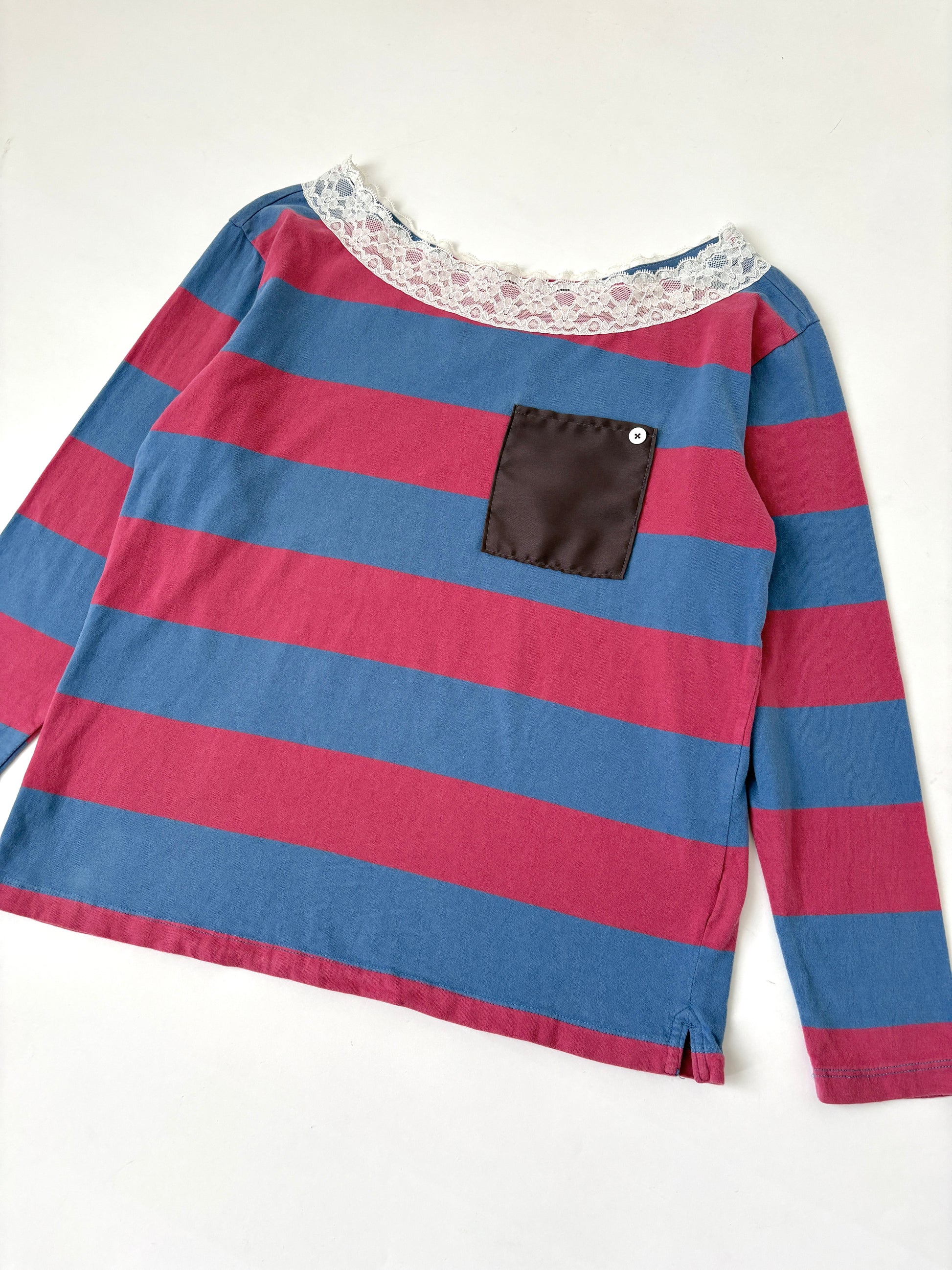 レースとボーダーの組み合わせでロマンティックカジュアルな一着𓇬ぜひ、アンバランスに肩を出して着ていただきたいです𓈒𓂂♩胸元の大きめのポケットは、少し光沢感のある生地を使用したのがポイント。カジュアルになりすぎないデザインに仕上げました。肌触りのよい生地感で、着心地の良いアイテムです○