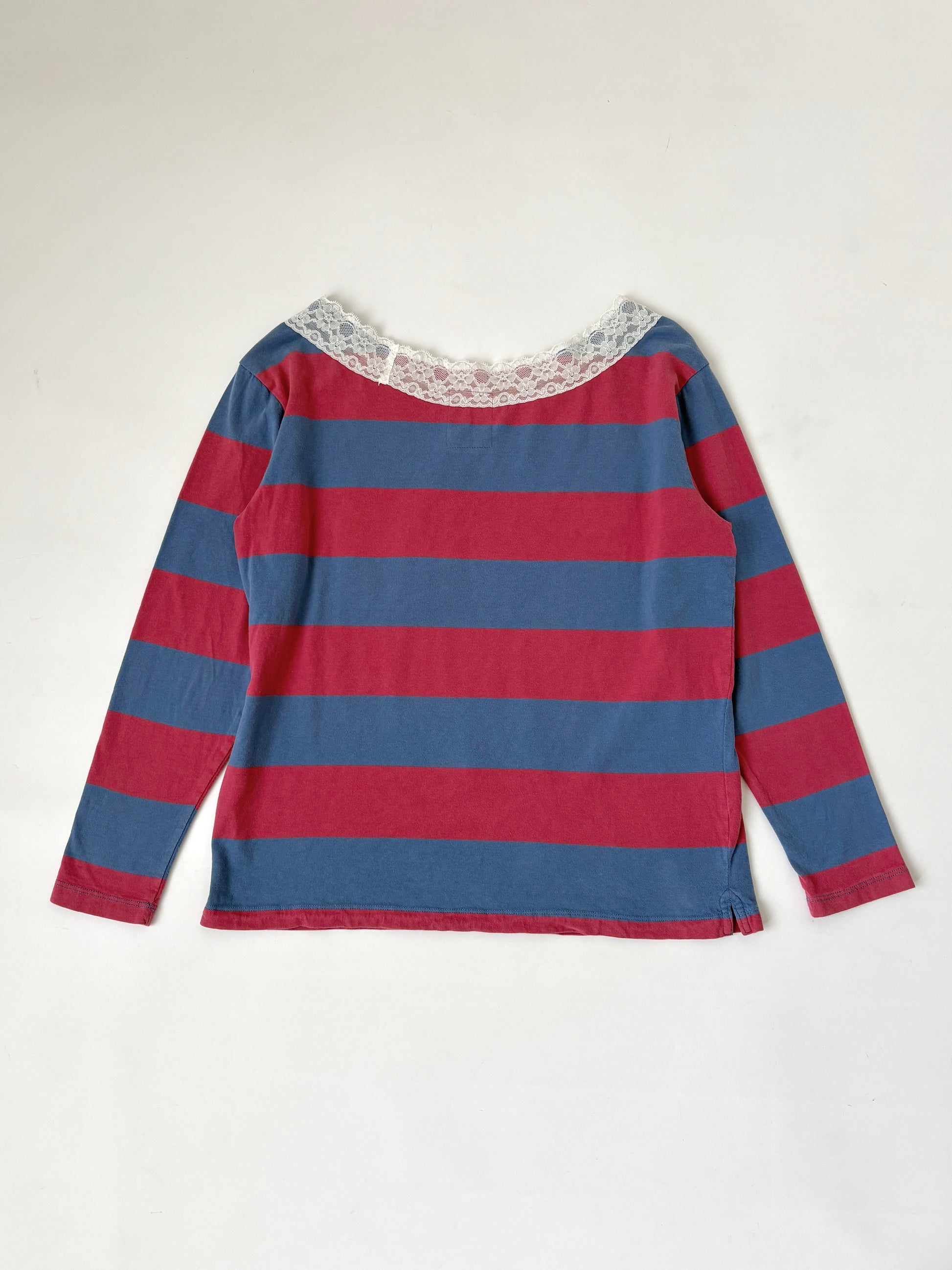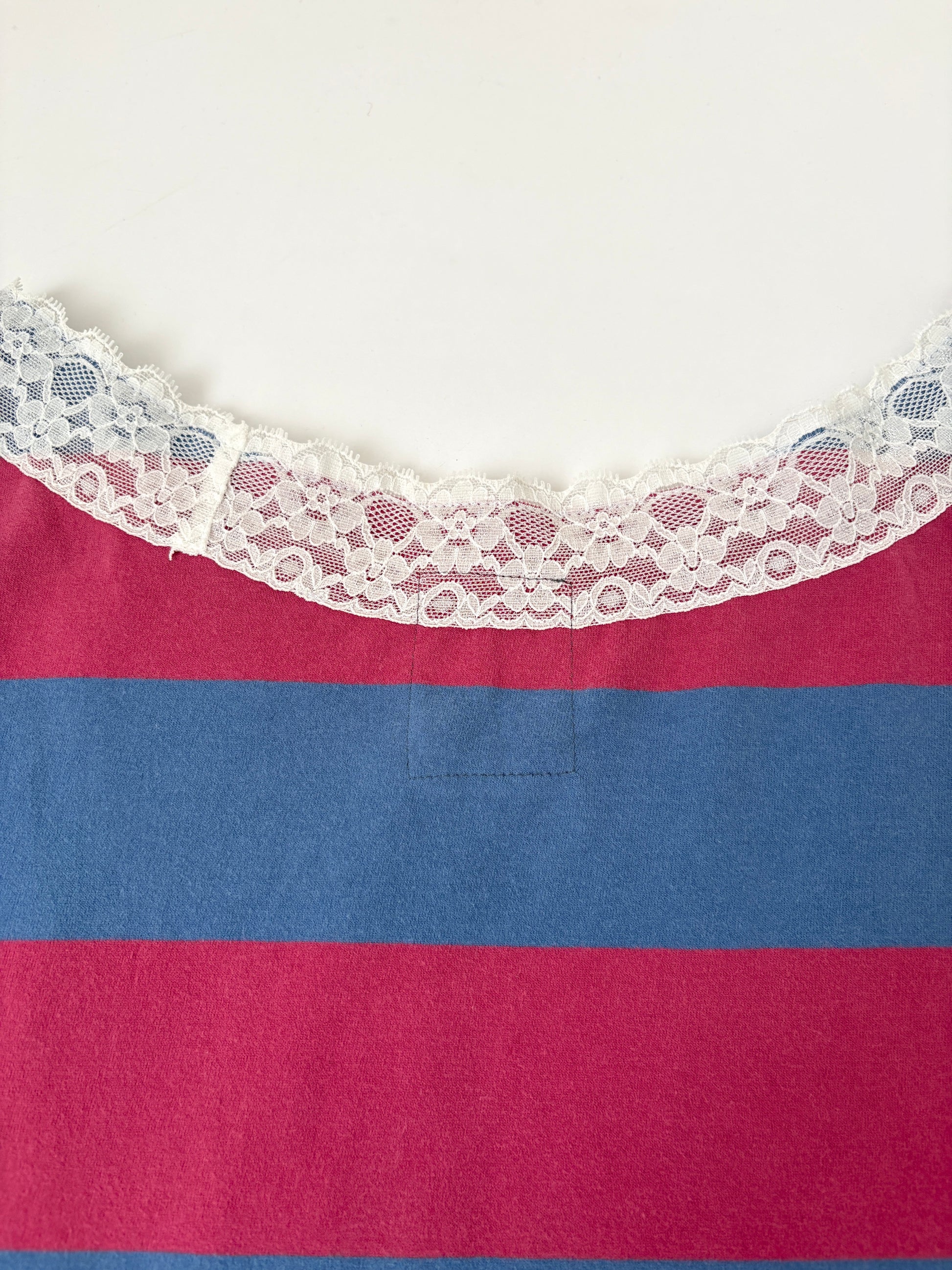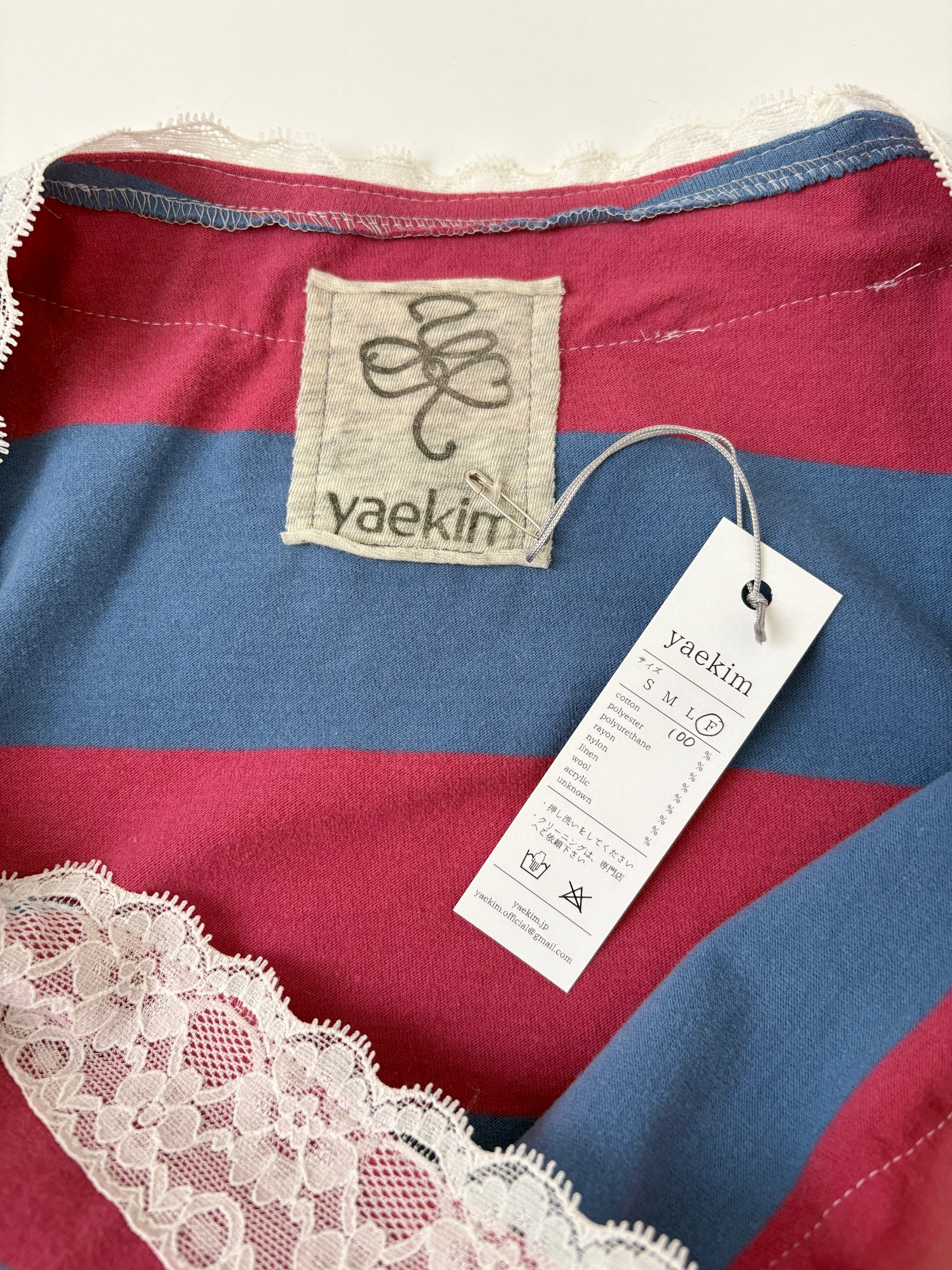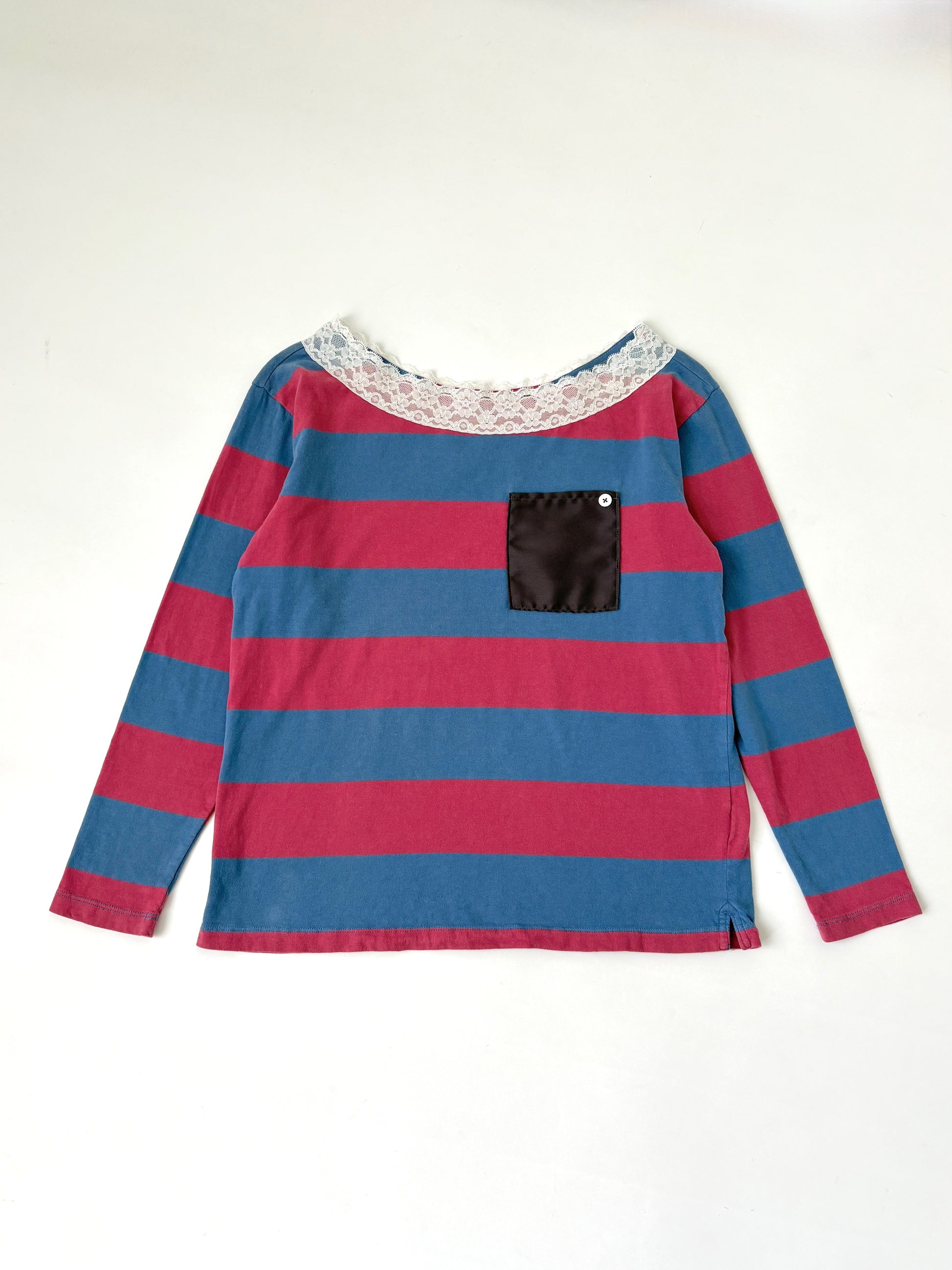 レースとボーダーの組み合わせでロマンティックカジュアルな一着𓇬ぜひ、アンバランスに肩を出して着ていただきたいです𓈒𓂂♩胸元の大きめのポケットは、少し光沢感のある生地を使用したのがポイント。カジュアルになりすぎないデザインに仕上げました。肌触りのよい生地感で、着心地の良いアイテムです○