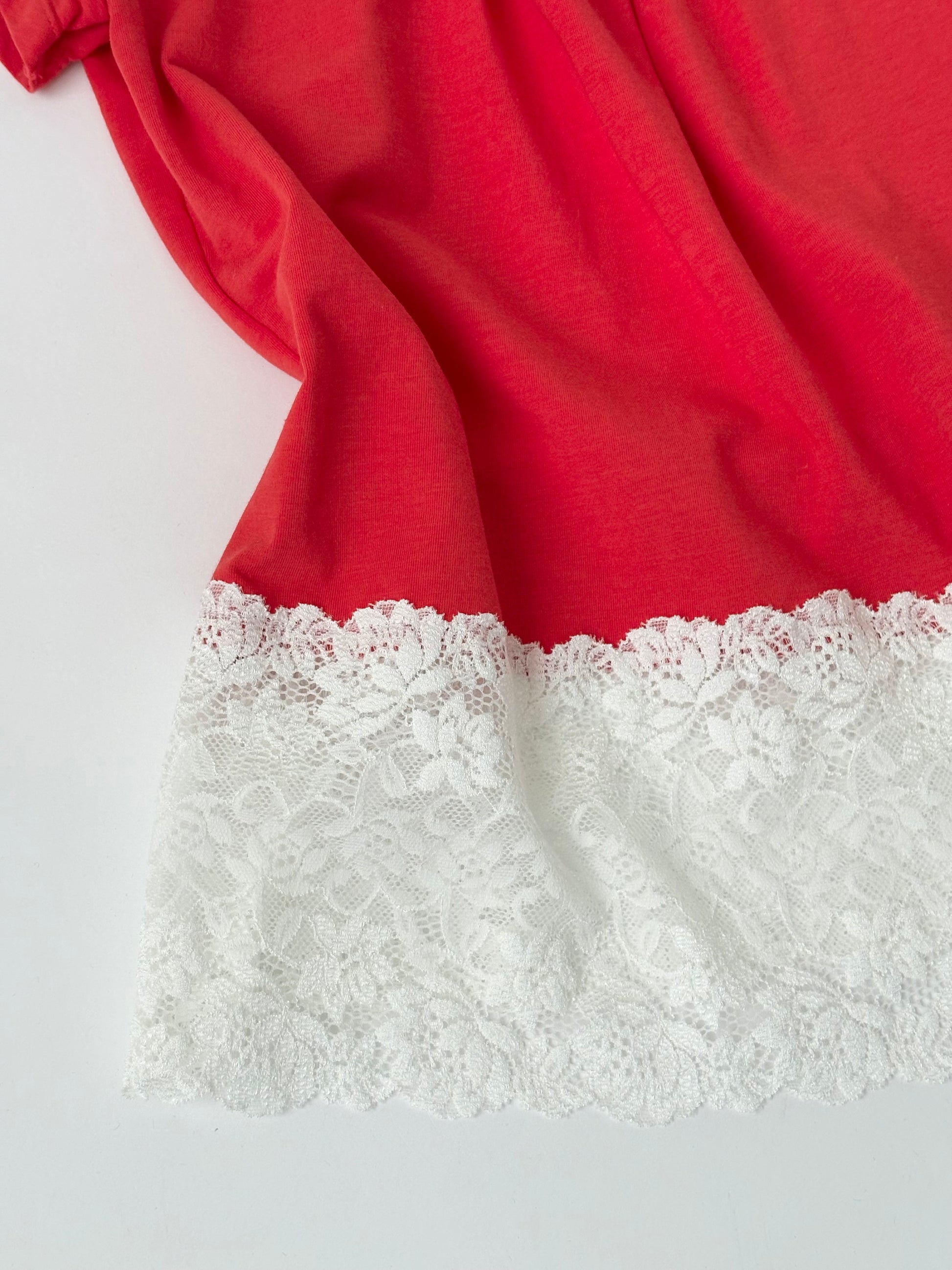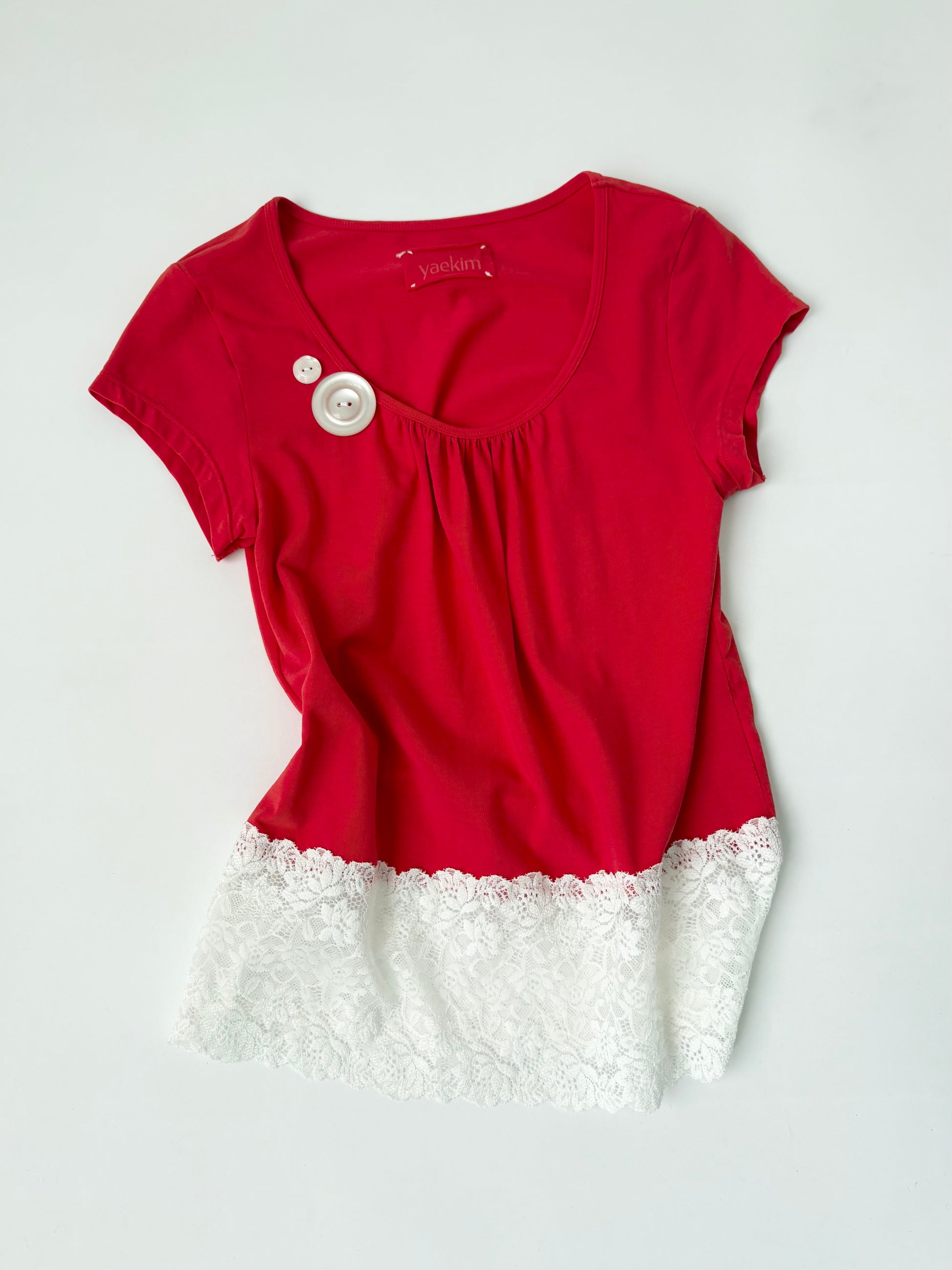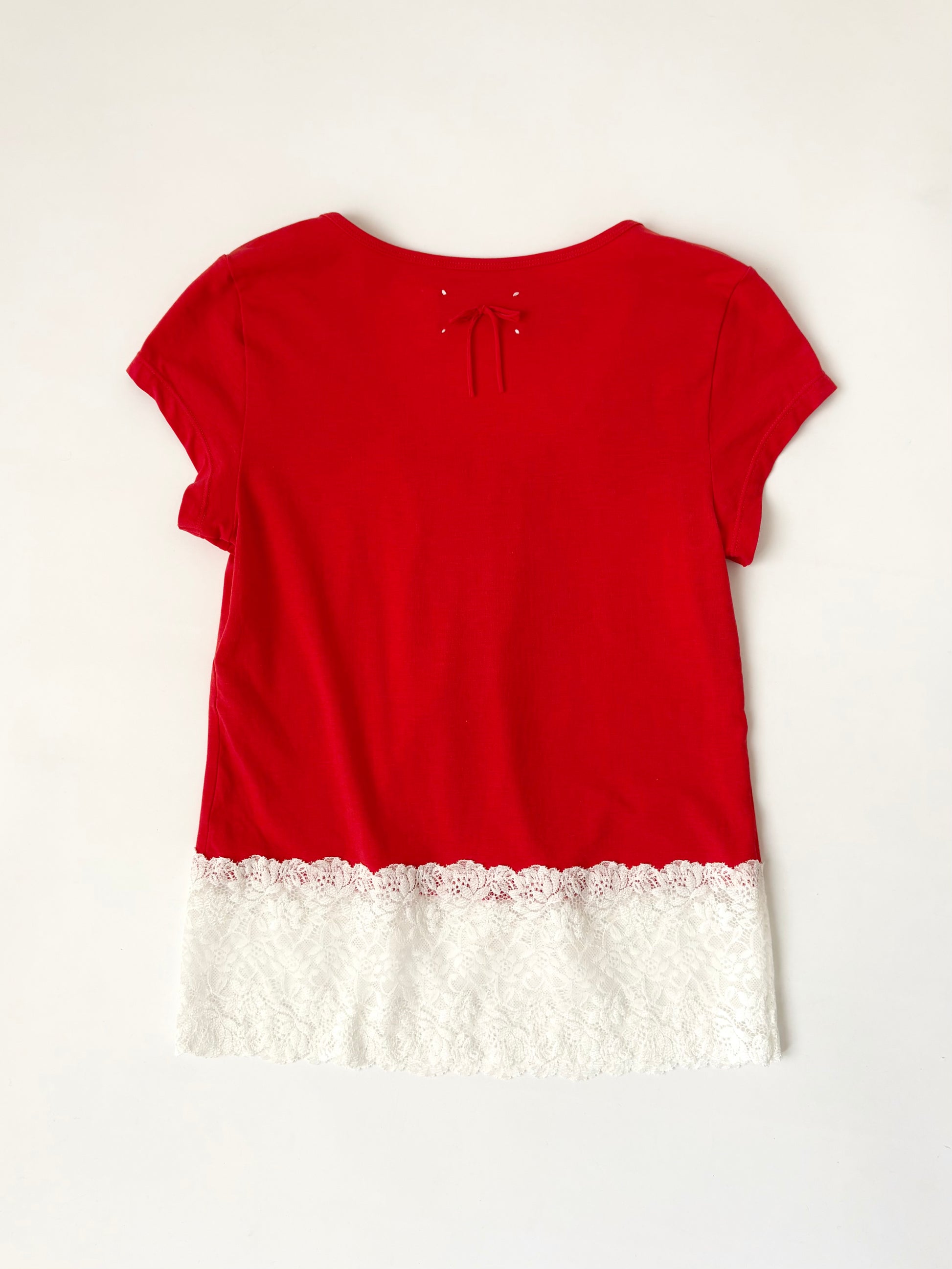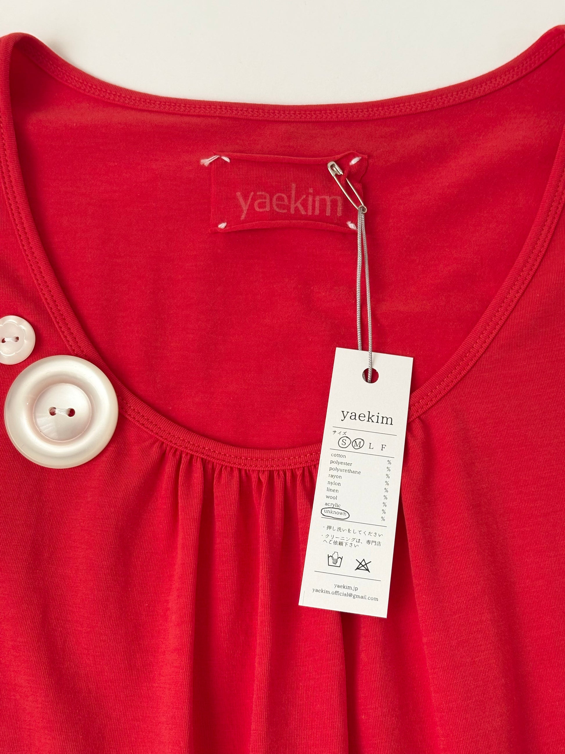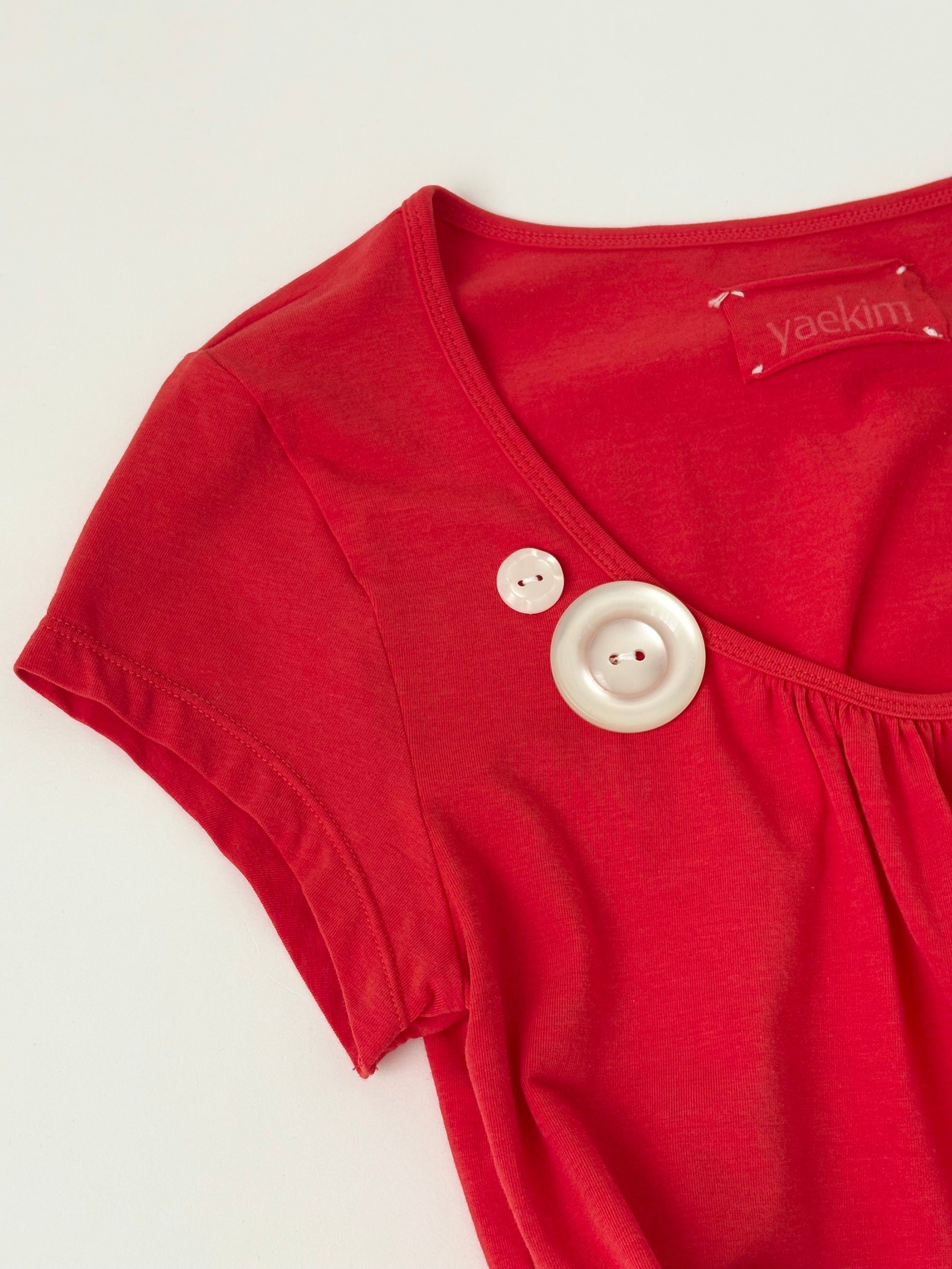 トレンド感のあるパキッとしたトマトカラーを活かして、シンプルながら1枚で様になるTシャツを目指しました。バックに取り付けた同生地で制作したリボンがポイント 𝜗𝜚