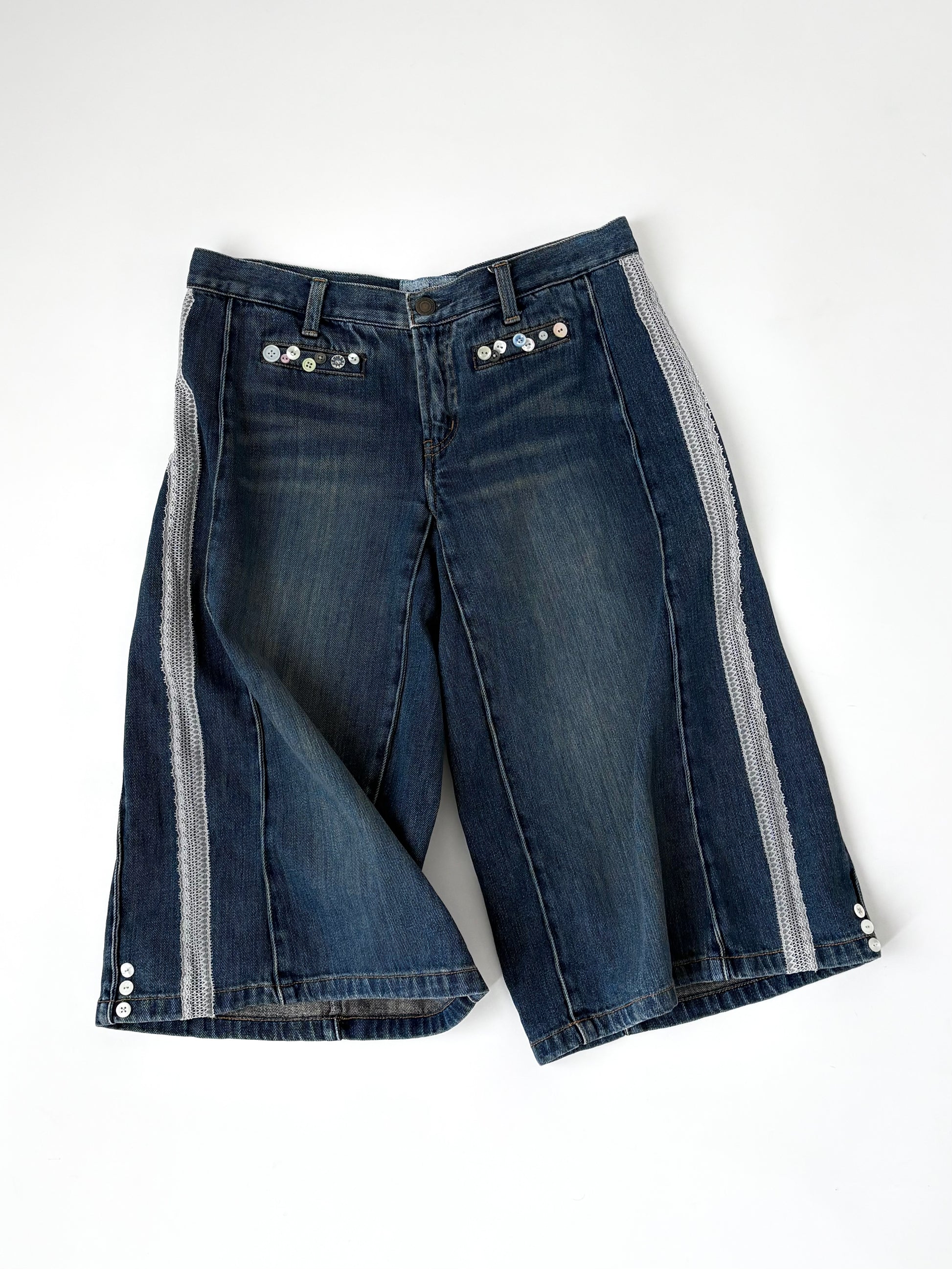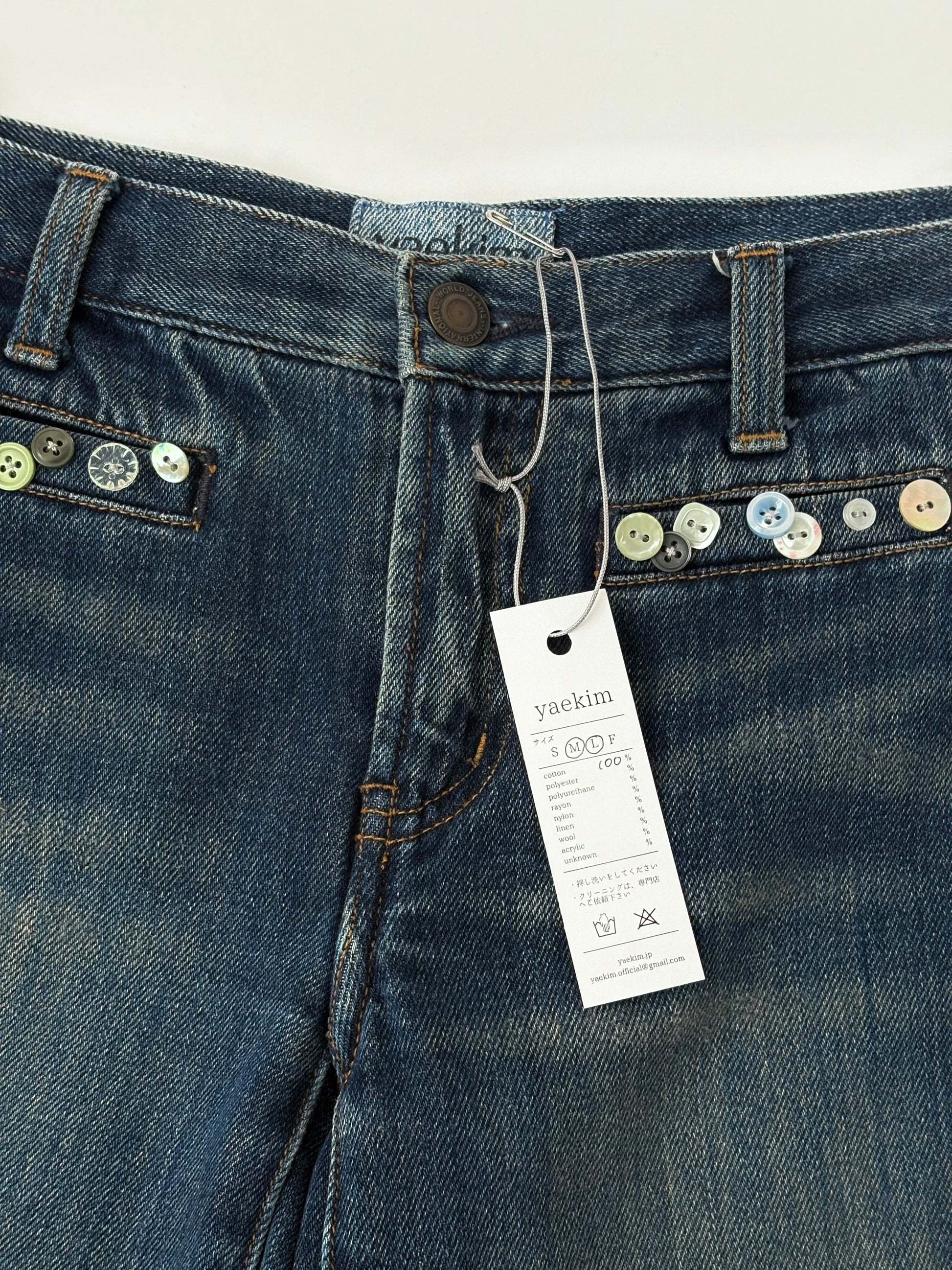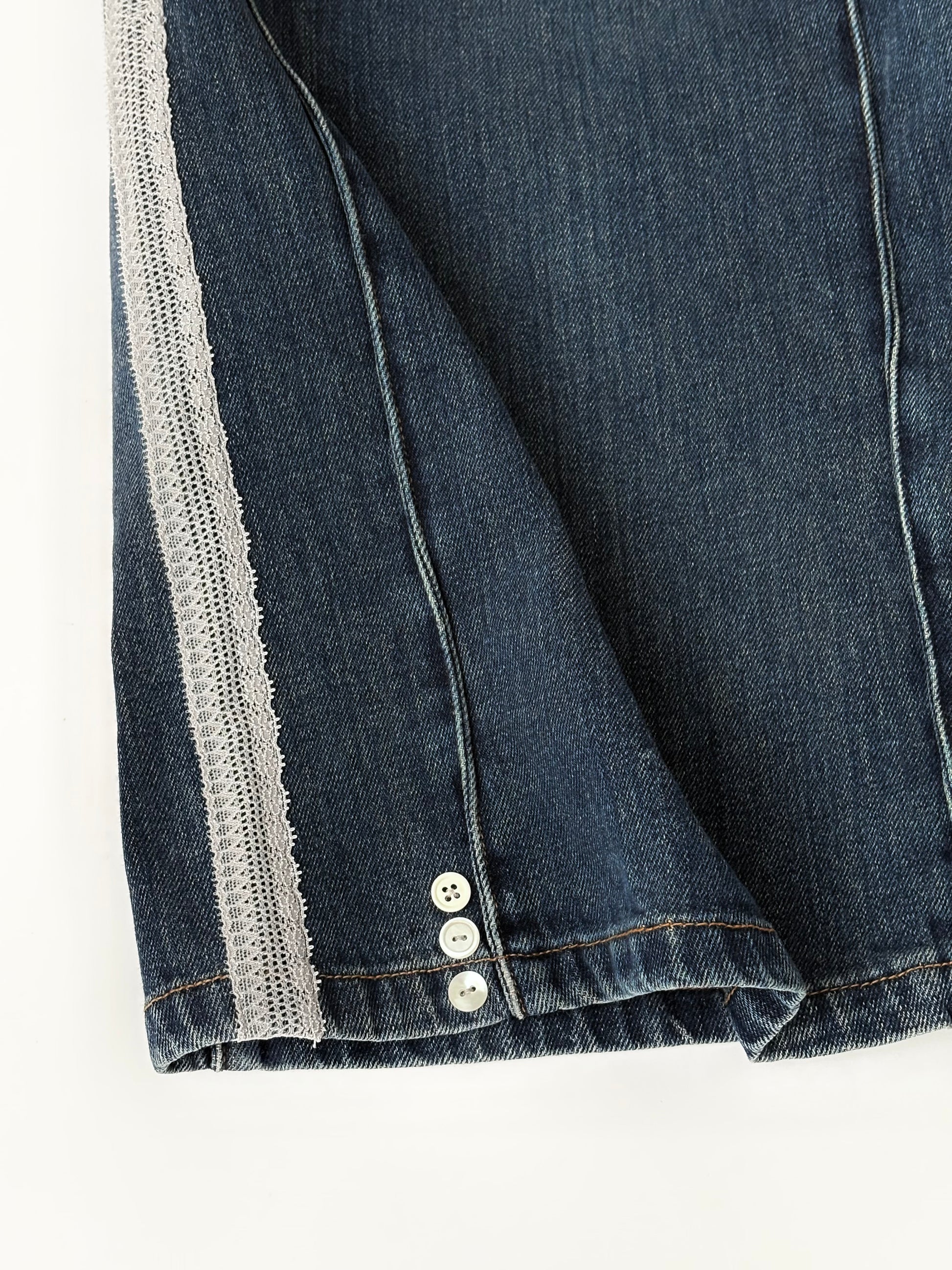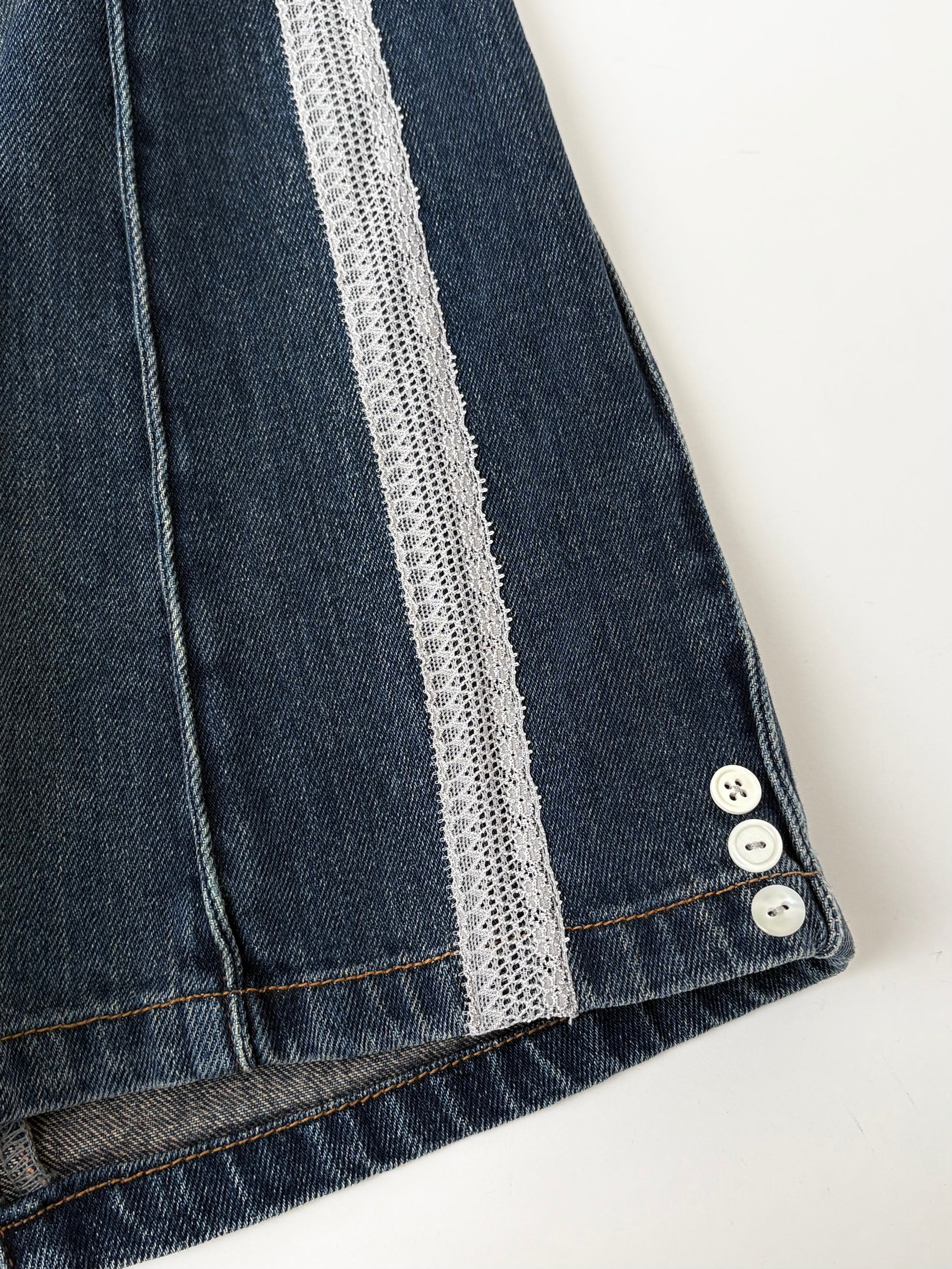 ボタンを散りばめて、サイドにはレースでラインをバックには別のデニムパンツからポケットを取って取り付けました✓⃝ 落ち着いたカラーでまとめたので華美にならず、気回しやすい1着かと思います。