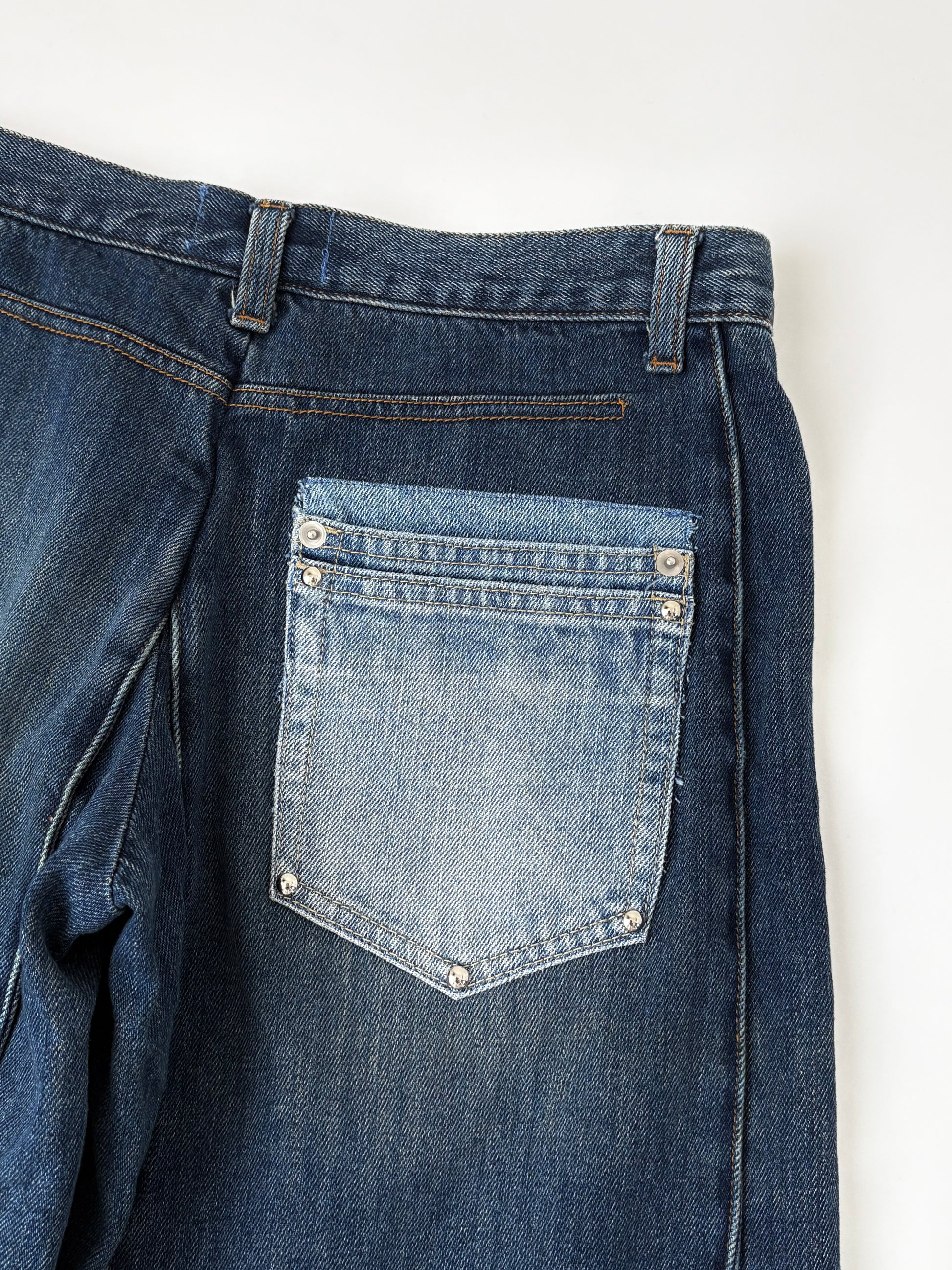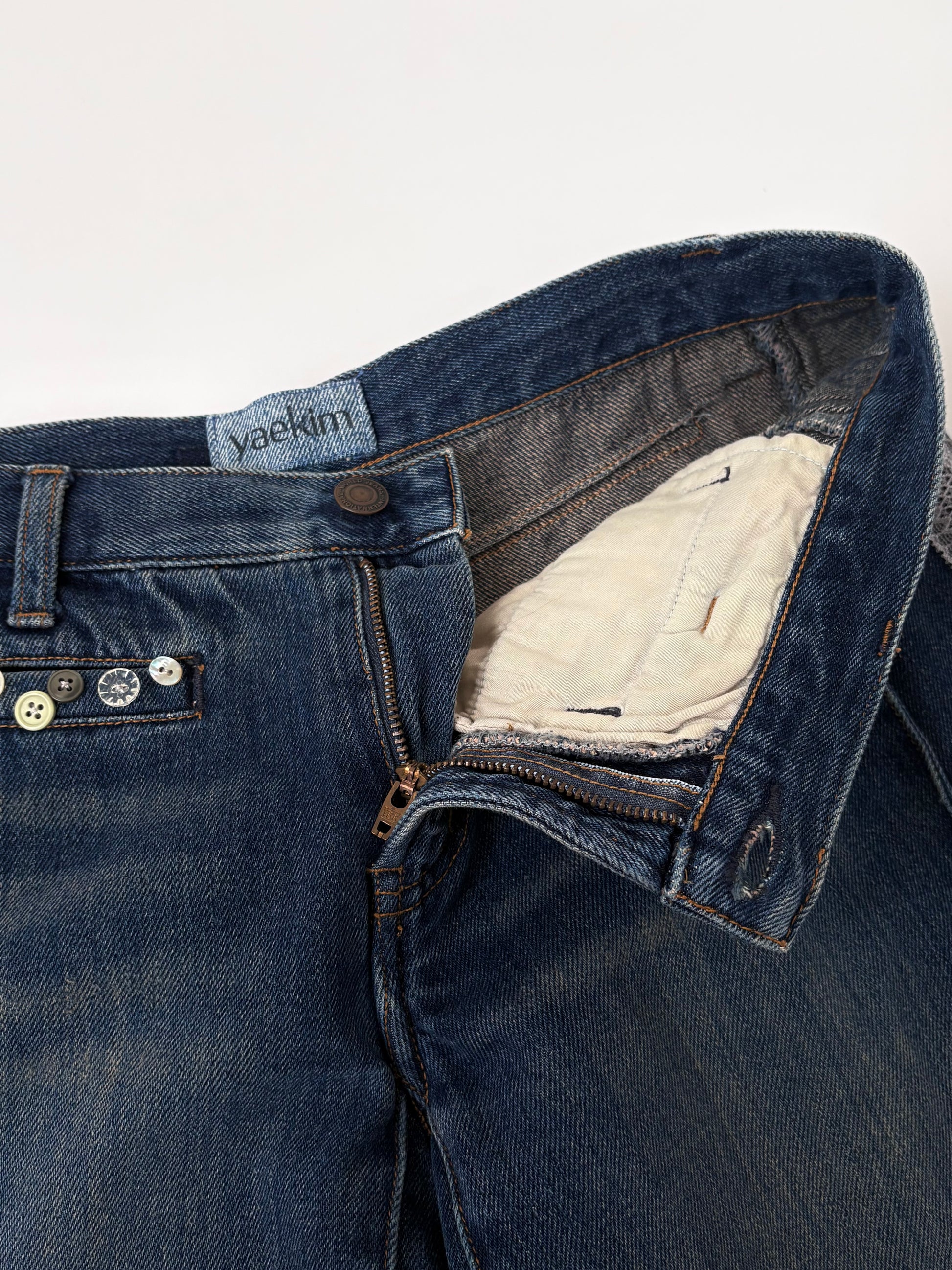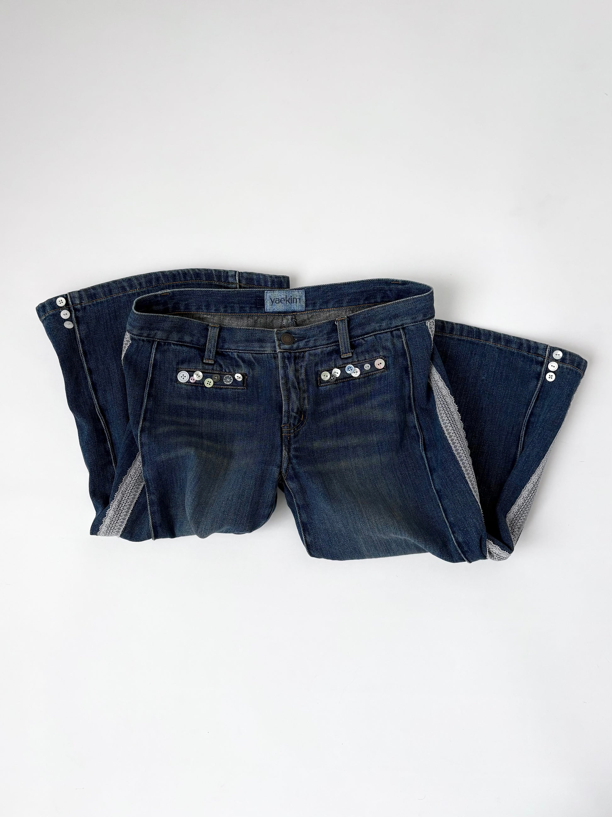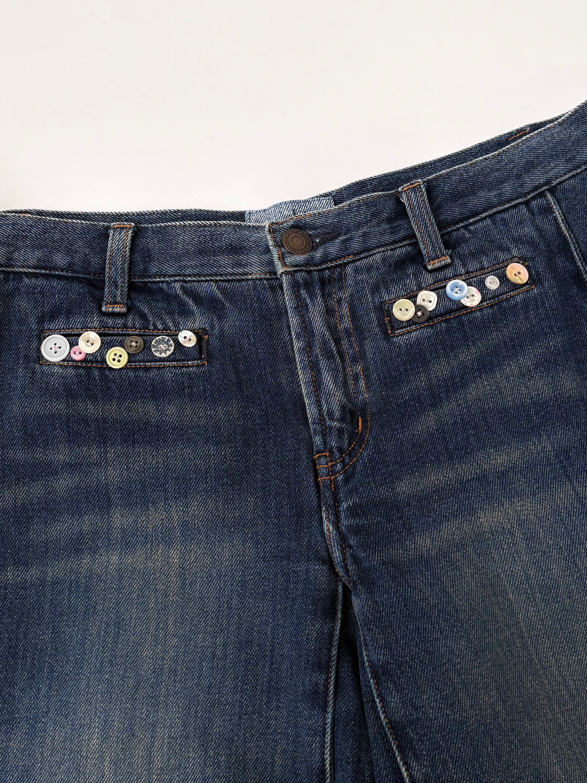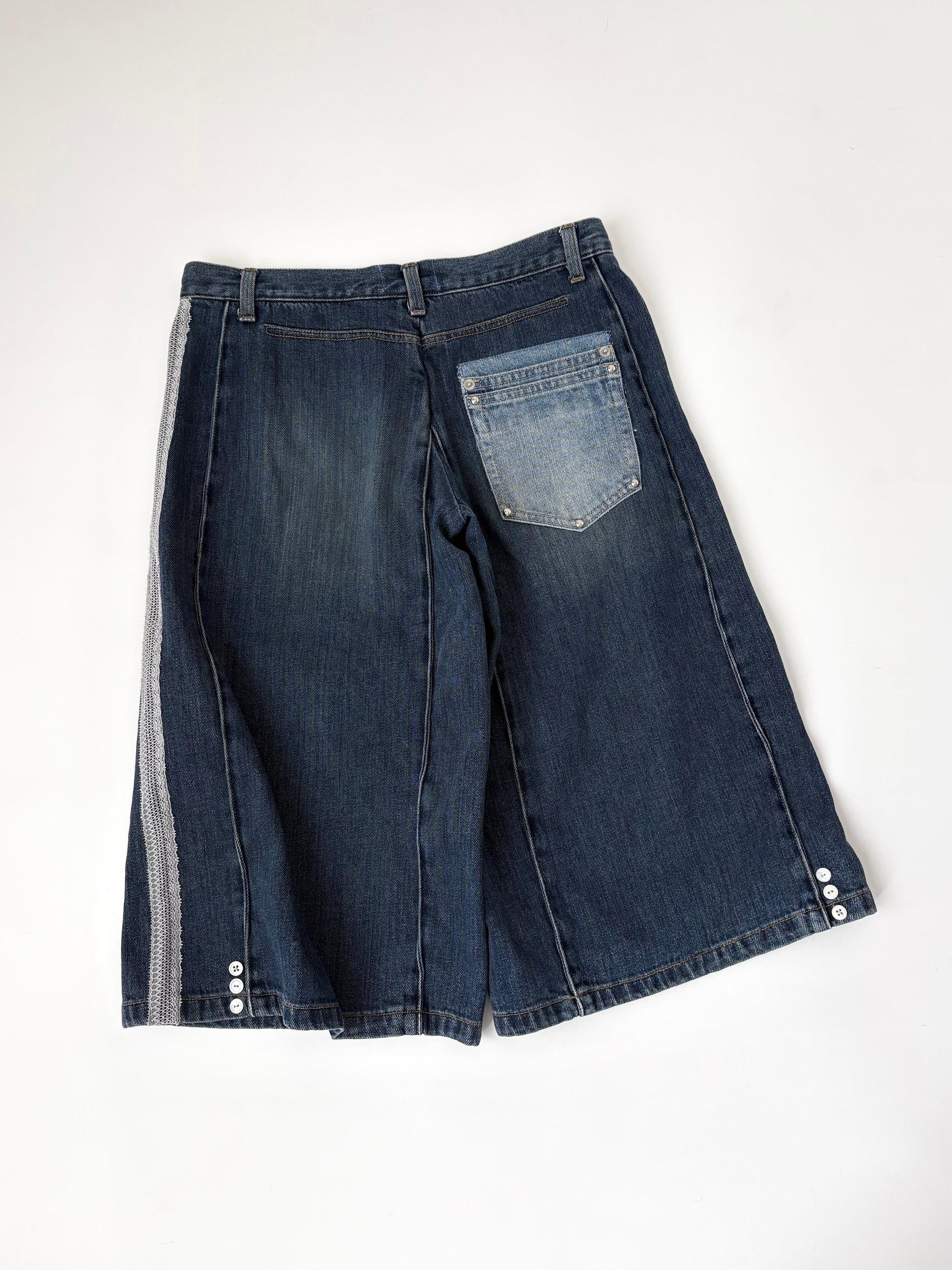 ボタンを散りばめて、サイドにはレースでラインをバックには別のデニムパンツからポケットを取って取り付けました✓⃝ 落ち着いたカラーでまとめたので華美にならず、気回しやすい1着かと思います。