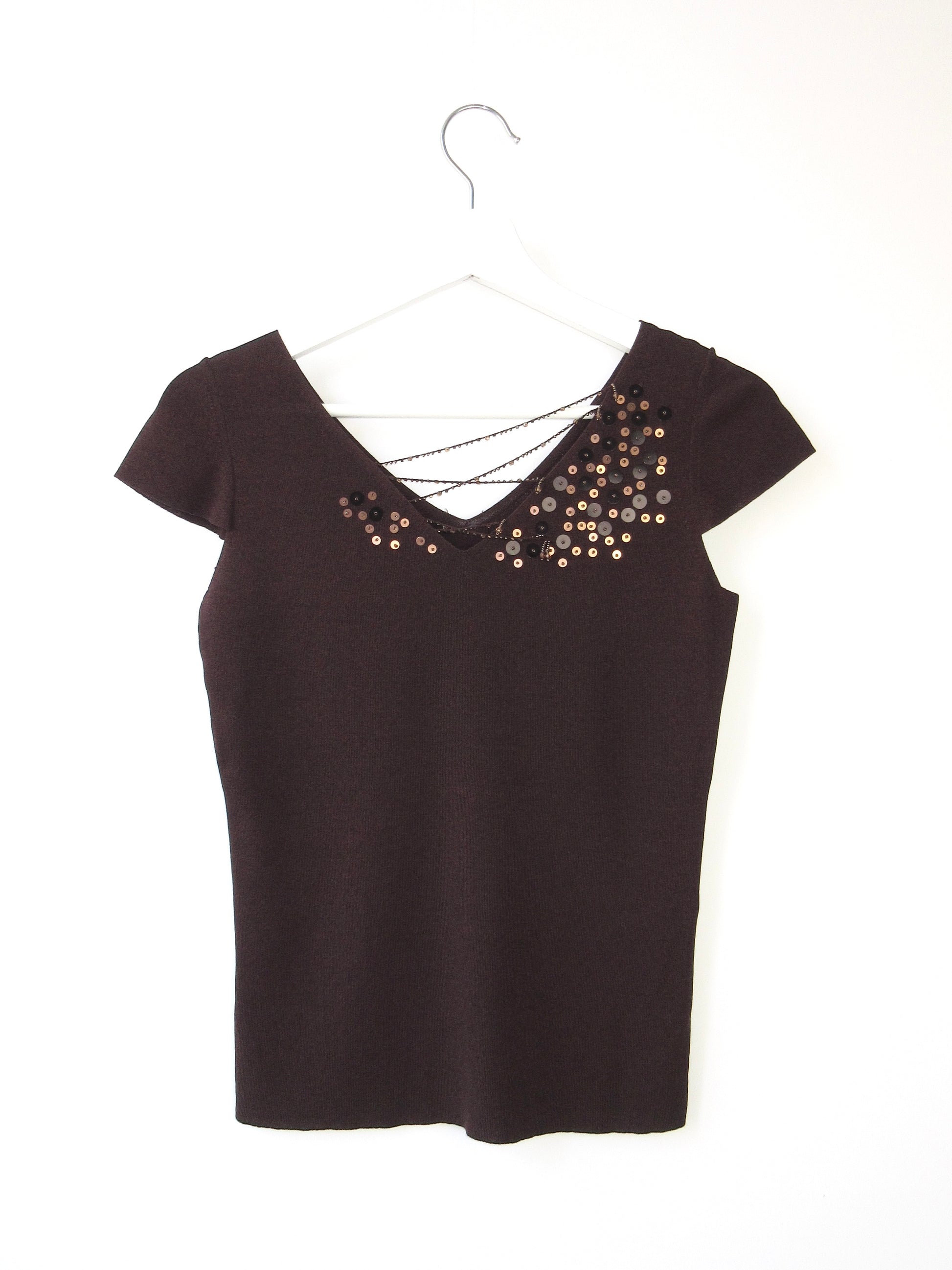 汚れやダメージのない良好なコンディションです。アンバランスに付けられたスパンコールやシルエットが素敵な1着。秋ムードなカラーですがサラサラとしたニット素材の為残暑が厳しい今時期に活躍しそうなアイテムです。