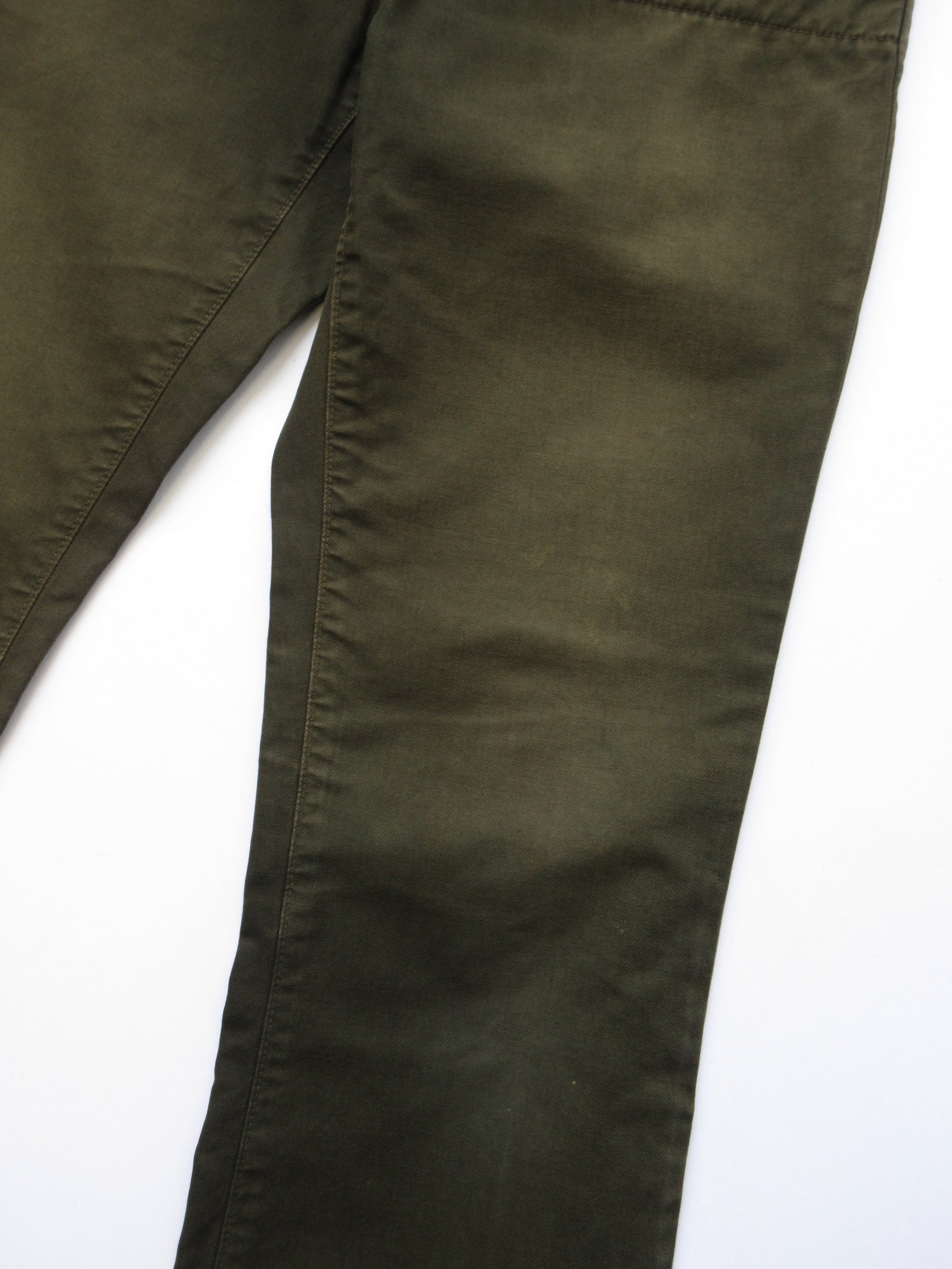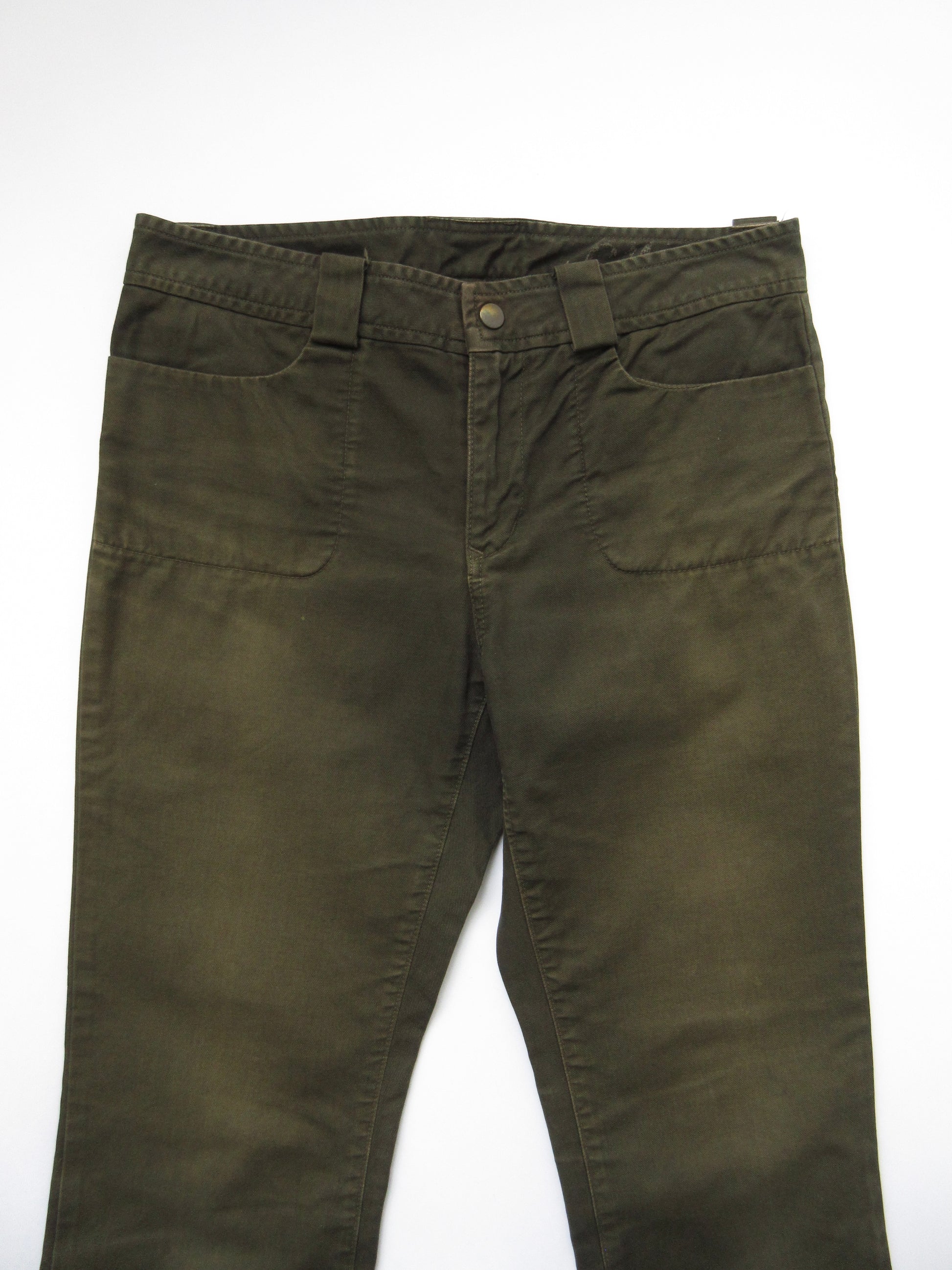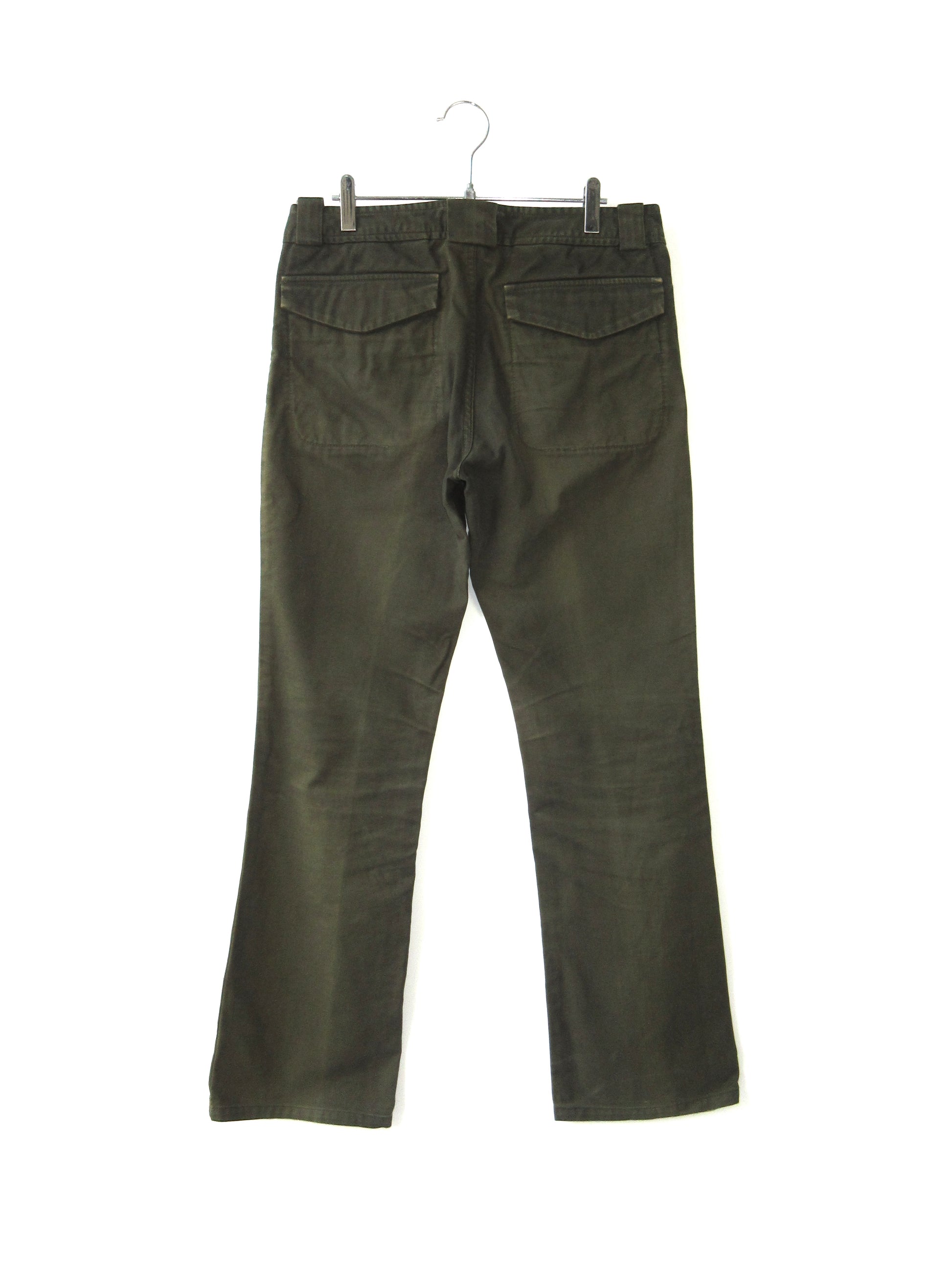 ポケットやベルトループのデザインが一癖ありで素敵なパンツ。元々のデザインなのか、褪色したのか分かりかねますが絶妙なカラーがこなれ感がありお洒落です。うっすらとシミ汚れがあります。詳細写真(6枚目)をご確認ください。Sサイズ相応モデルにはウエストが大きく、写真はウエストをつまんで着用しています。