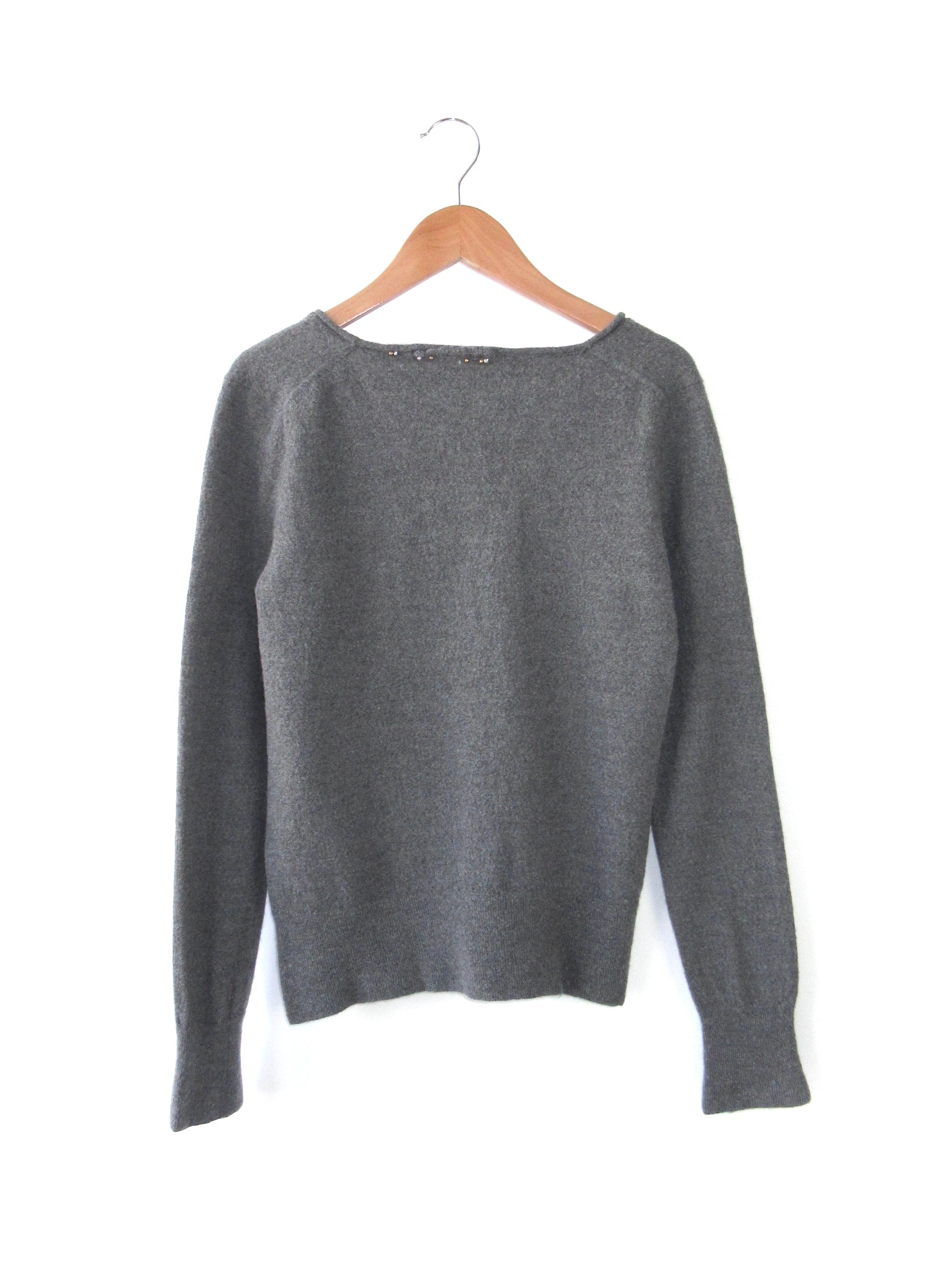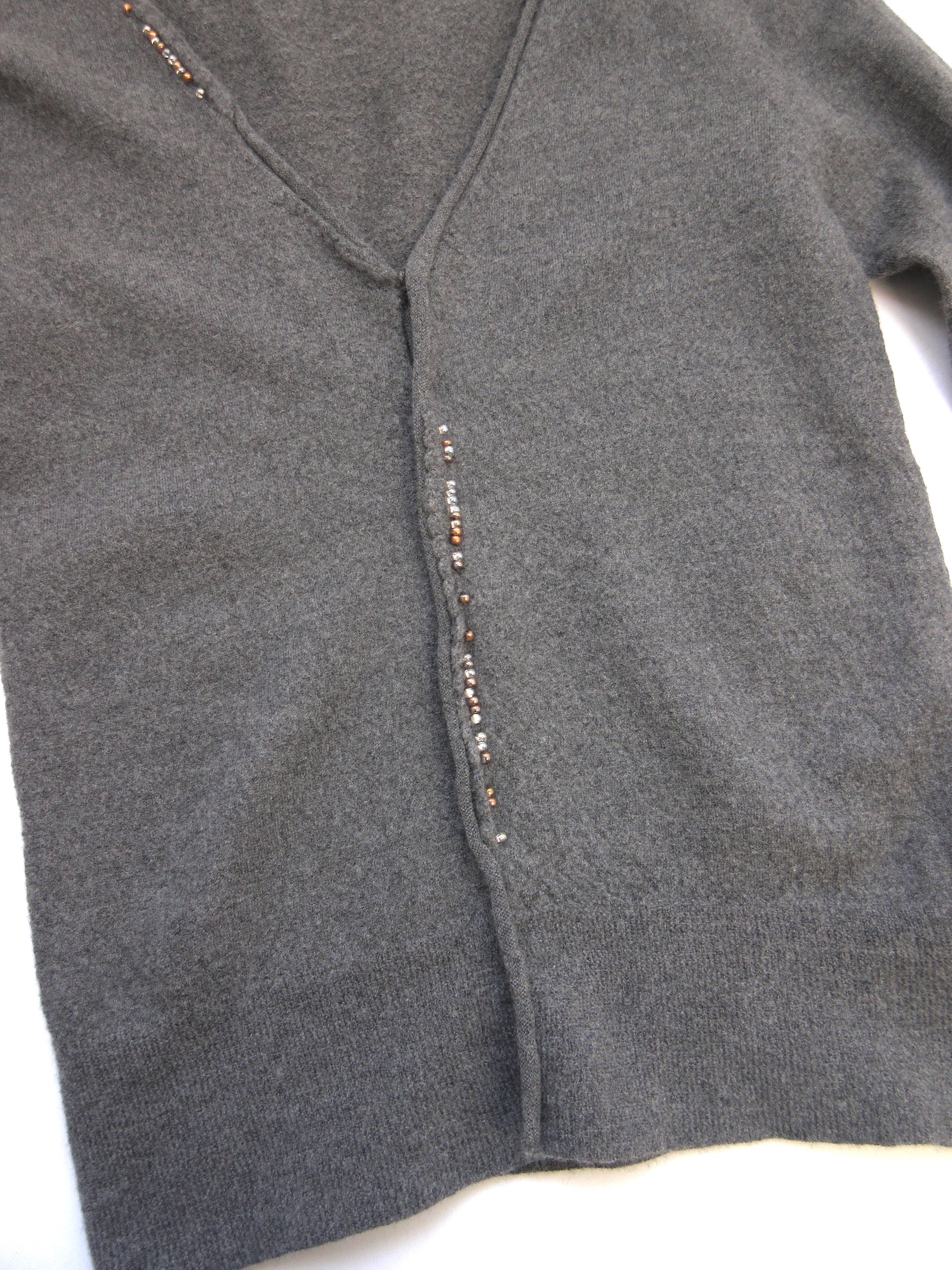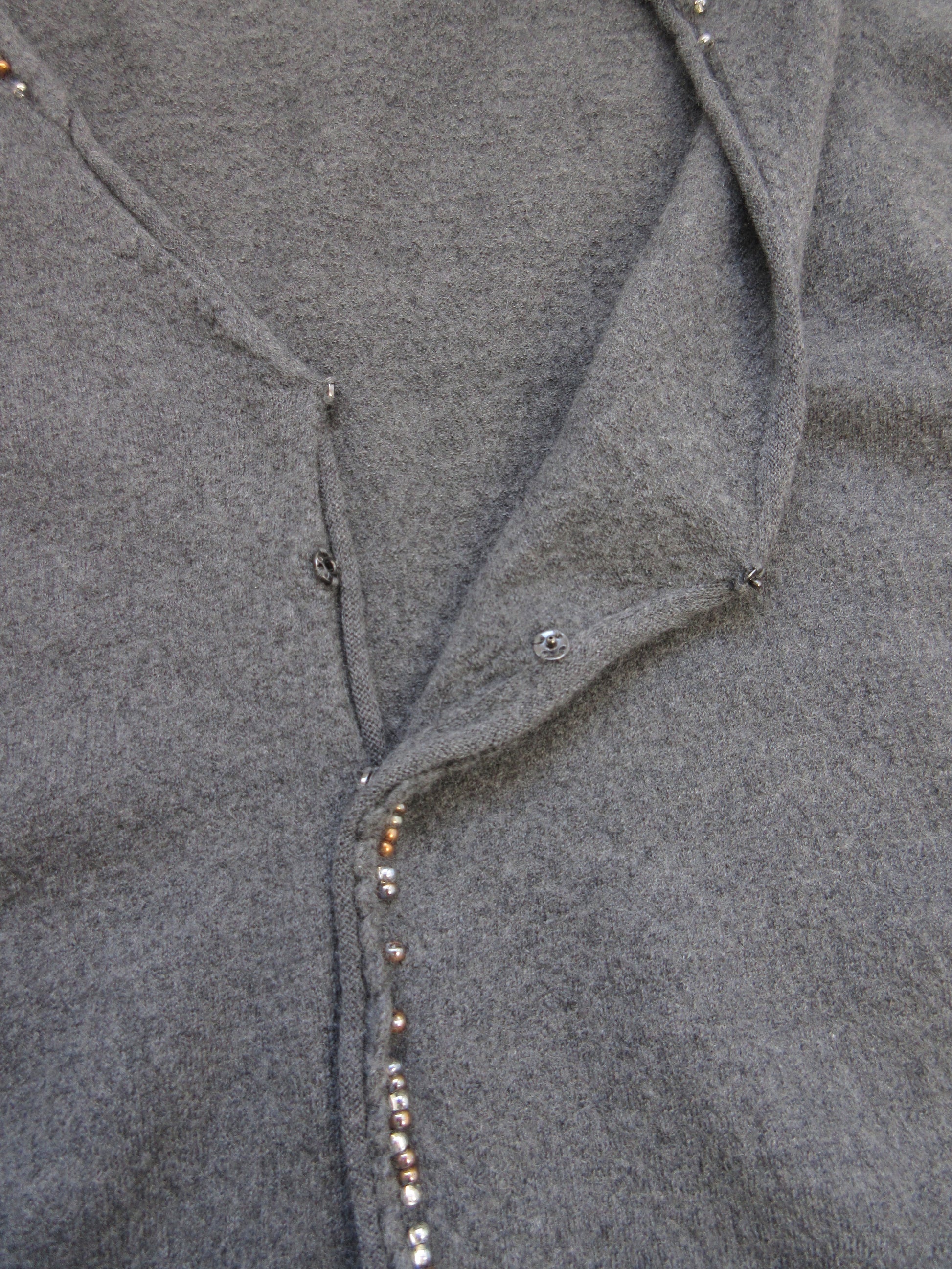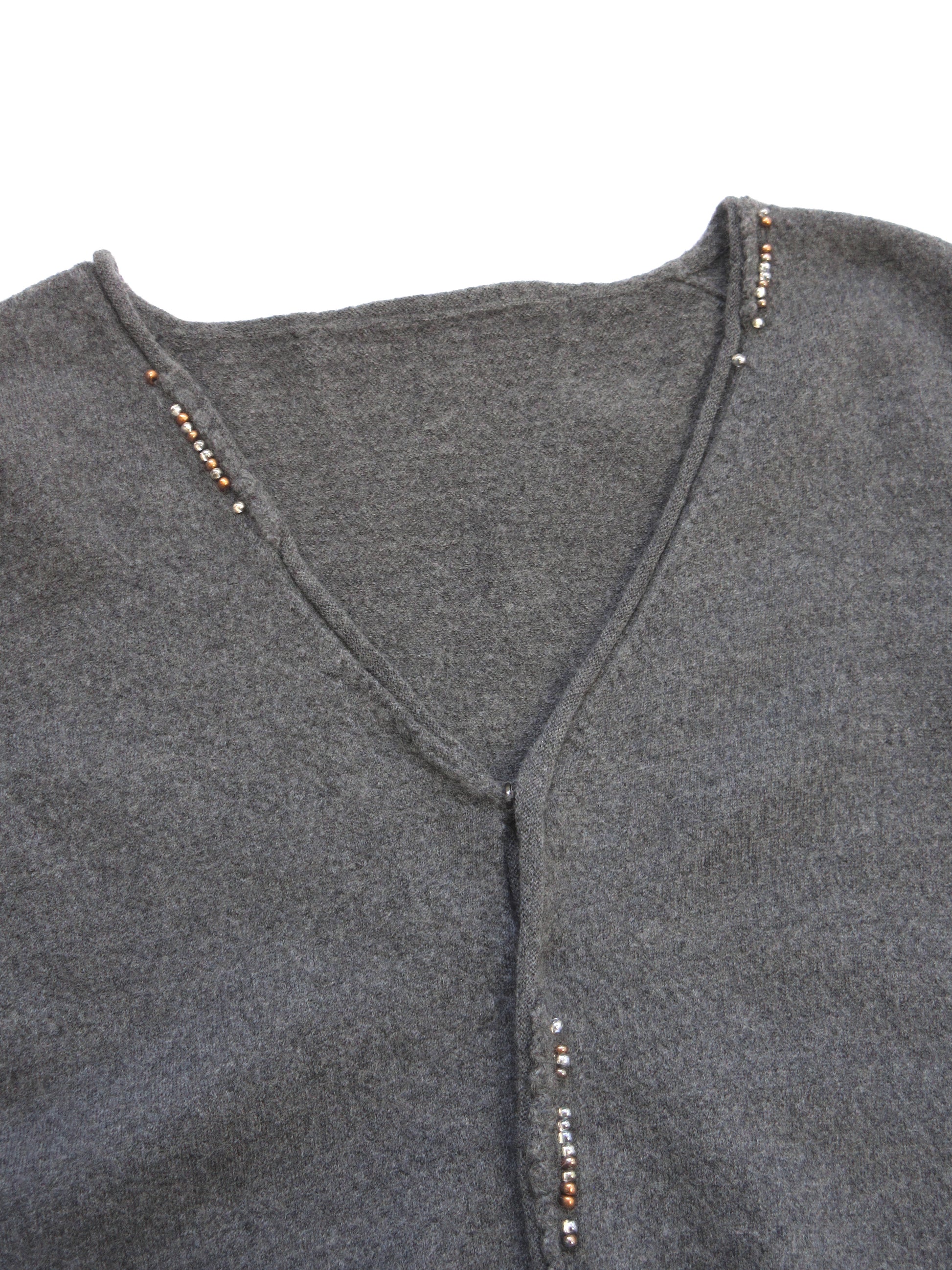 フロントのさりげないビーズ使いが可愛いカーディガン。ホームクリーニングによりやや縮んでしまい腕周りがタイトなので普段Sサイズの方、又はインナーにキャミなど袖なしのものを着用するといいかと思います。汚れのない比較的良好なコンディションです。